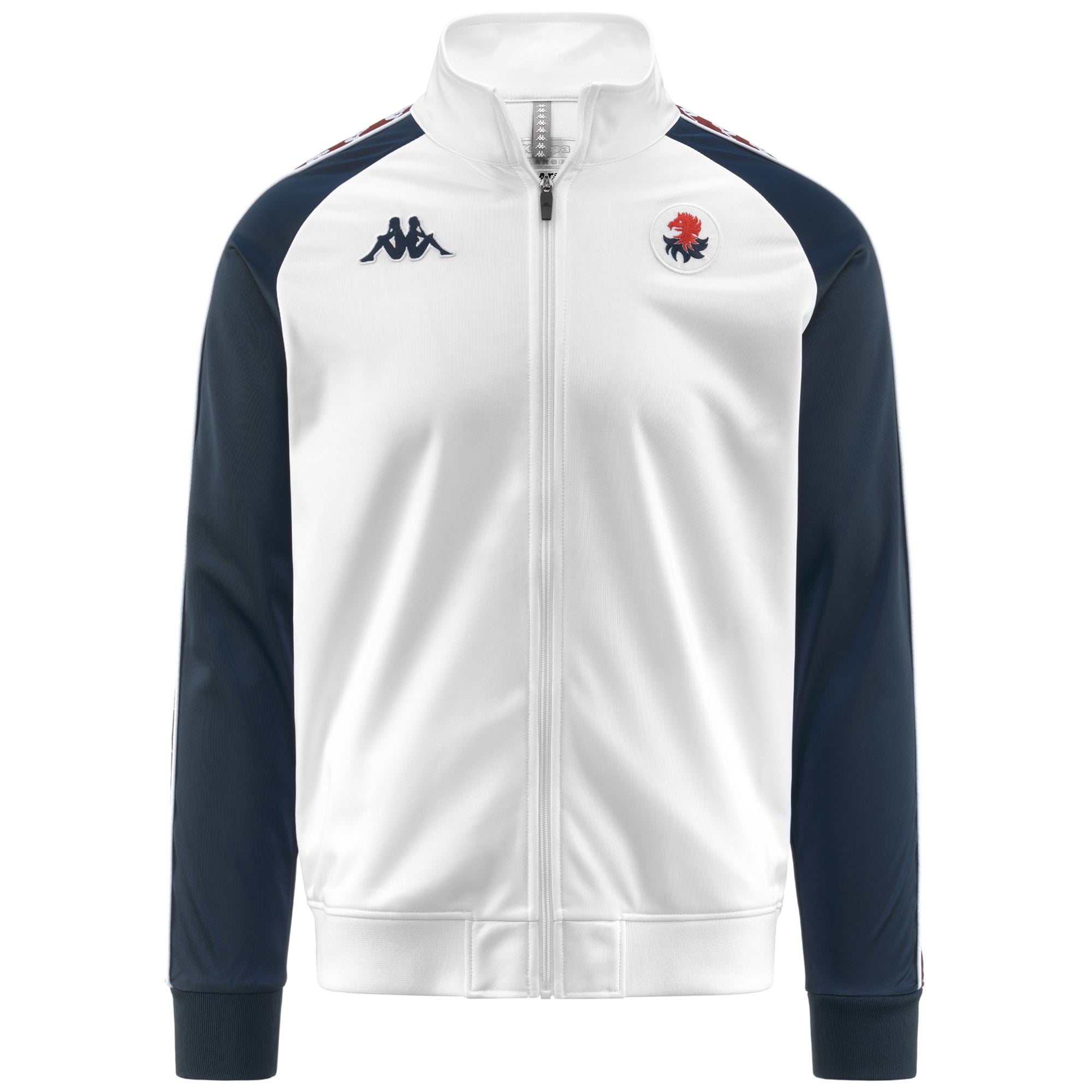 GARA.Man jacket in brushed tricot.SLIM FIT.Rib borders. full zip in front. two front pockets with zip.Omini Logo tape with graphics and piping on sleeves. gabardine omini logo and Team logo embroidered on front.GENOA CFC.