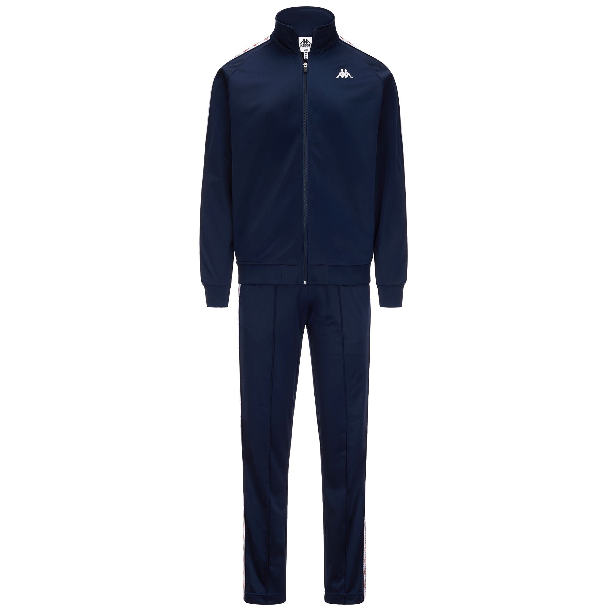 The first tracksuit in the world with multiple logo on tape. Realized in brushed tricot. REGULAR FIT.Omini logo tape in jacquard with piping. Rib borders. nylon full zip in front. two front pockets. Waist band with elastic inside and drawcord on pants.Laser cut Omini logo.