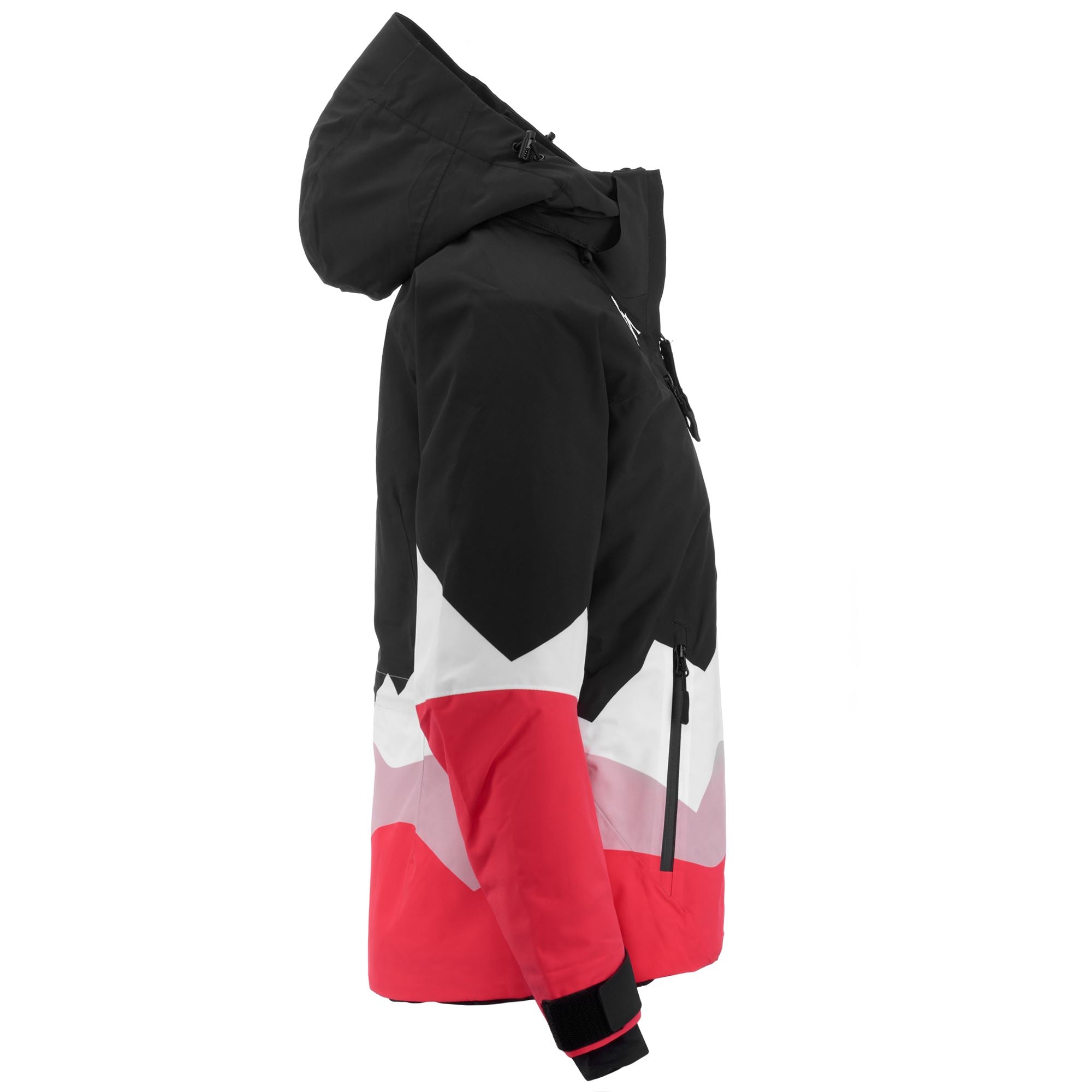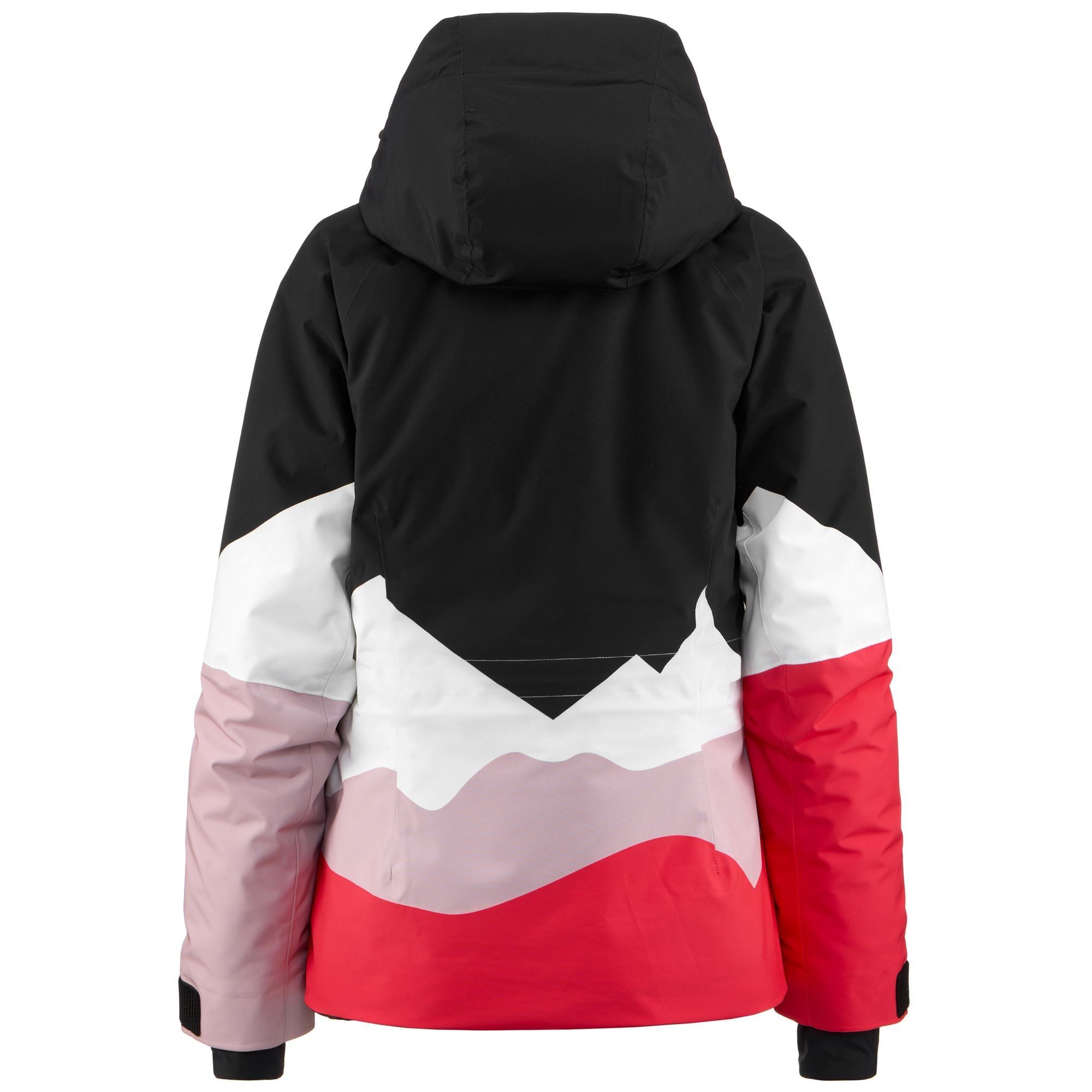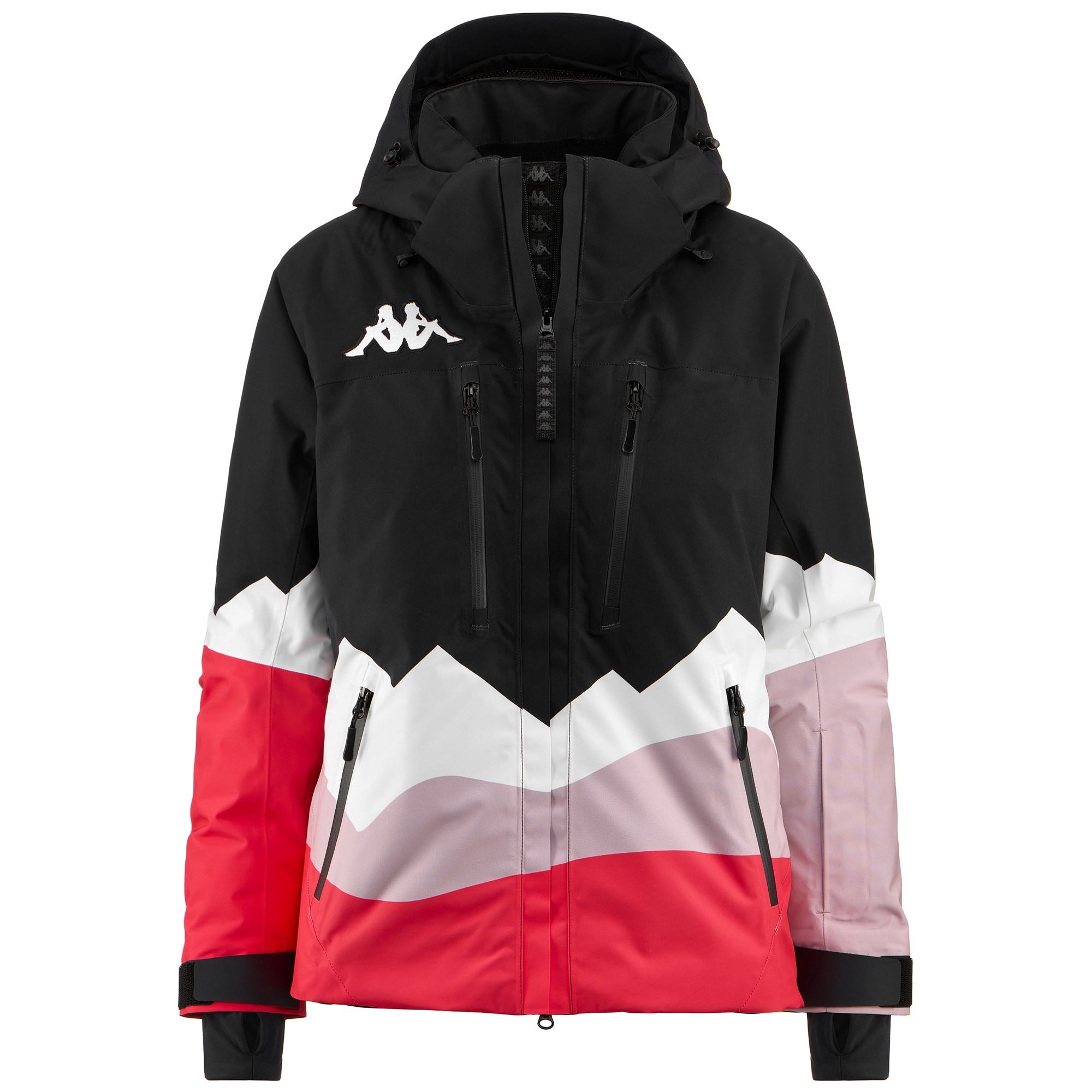 SPORT.Woman padded jacket in mechanical stretch fabric with WATER PROTECTION. CLIMA PROTECTION. WATERPROOF PROTECTION 20000 mm. BREATHABILITY 20000gr/m2/24. padding Fellex?? 180gr. KAPPA SKI SYSTEM TECHNOLOGY ???.REGULAR FIT. Fabric with pattern printed. detachable hood. waterproof zip pockets. reinforced shoulder. ventilation zip. inner gaiter. cuff gaiters in stretch fabric. heat sealed seams. regulation adjustments.Logo Omini embroidery.