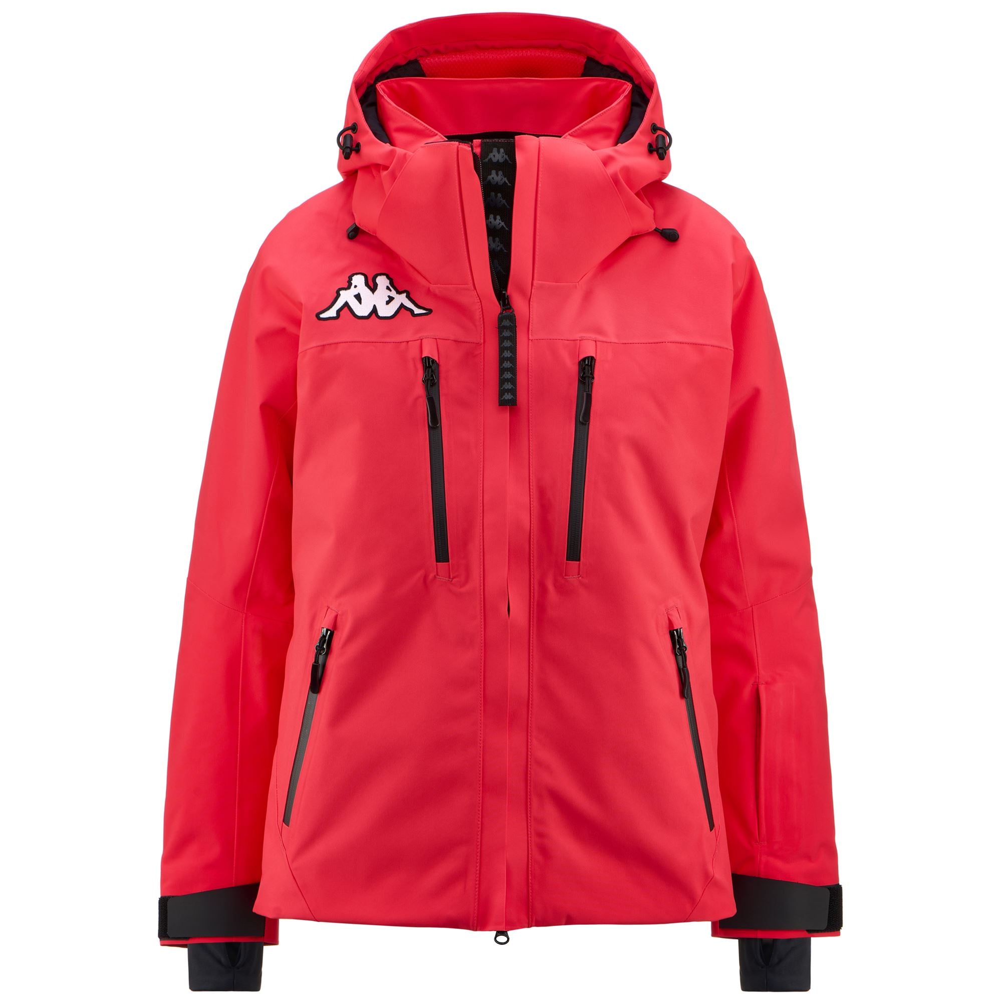 SPORT.Woman padded jacket in mechanical stretch fabric with WATER PROTECTION. CLIMA PROTECTION. WATERPROOF PROTECTION 20000 mm. BREATHABILITY 20000gr/m2/24. padding Fellex?? 180gr. KAPPA SKI SYSTEM TECHNOLOGY ???.REGULAR FIT. Fabric with pattern printed. detachable hood. waterproof zip pockets. reinforced shoulder. ventilation zip. inner gaiter. cuff gaiters in stretch fabric. heat sealed seams. regulation adjustments.Logo Omini embroidery.