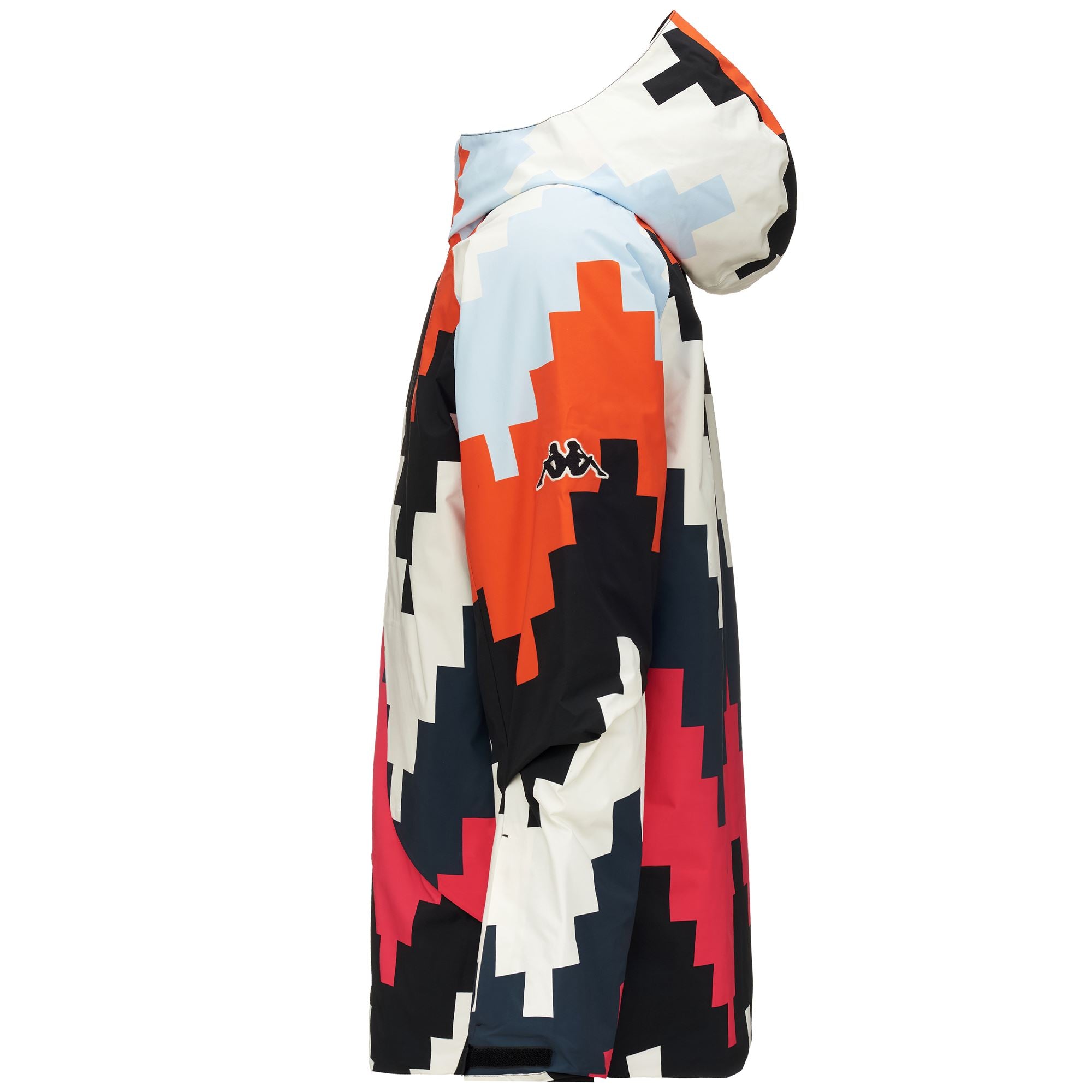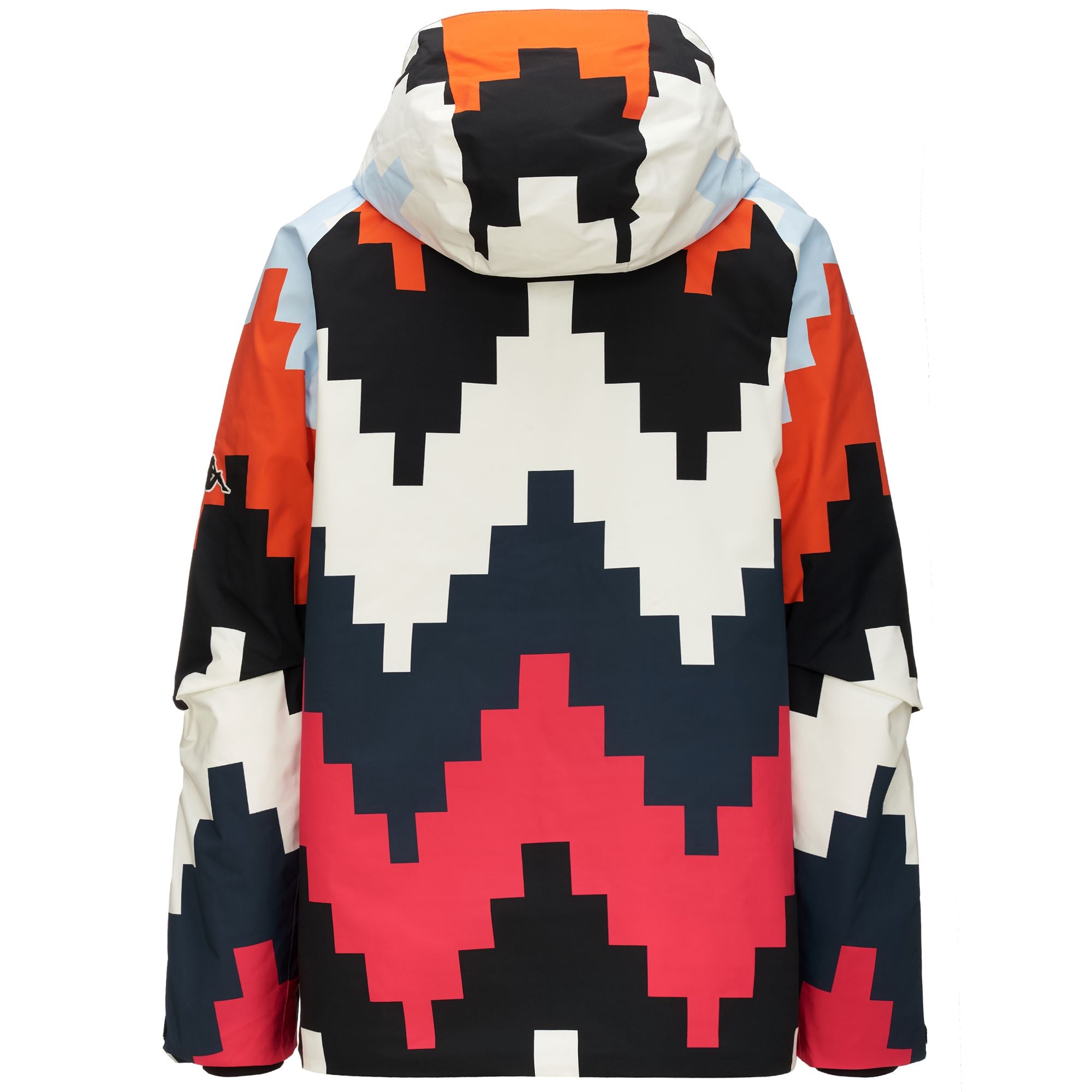 SPORT.Man padded jacket in stretch fabric with WATER PROTECTION. CLIMA PROTECTION. WATERPROOF PROTECTION 10000 mm. BREATHABILITY 10000gr/m2/24. padding 80gr.OVERSIZE FIT. Hood. waterproof zip pockets. chest pockets covered. secret pocket under central opening flap. ventilation zip. cuff gaiters in stretch fabric. heat sealed seams. body regulation adjustments.Random all over Graphic.Logo Omini embroidery.