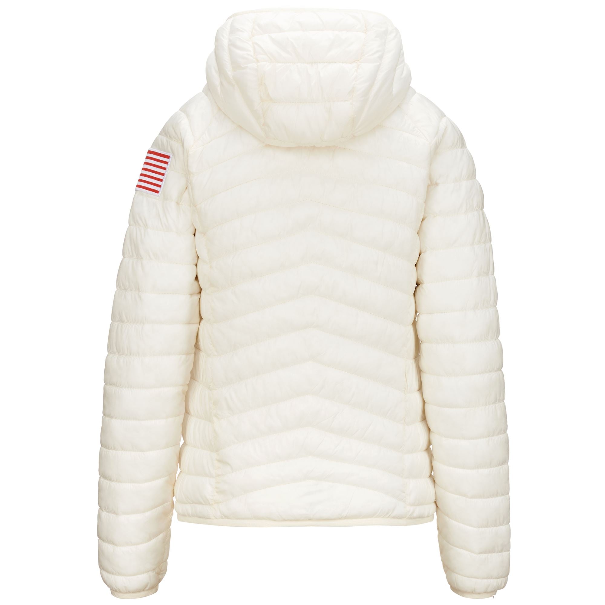 GARA.Woman quilted padded jacket in nylon ripstop with WATER PROTECTION. CLIMA PROTECTION. Primaloft? Insulation padding.SLIM FIT.Fixed hood. zip pockets. Embroidered Omini logo.US SKI AND SNOWBOARD.