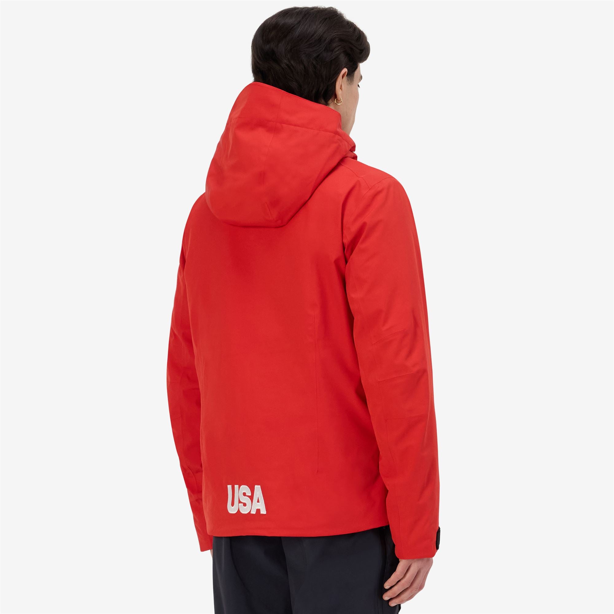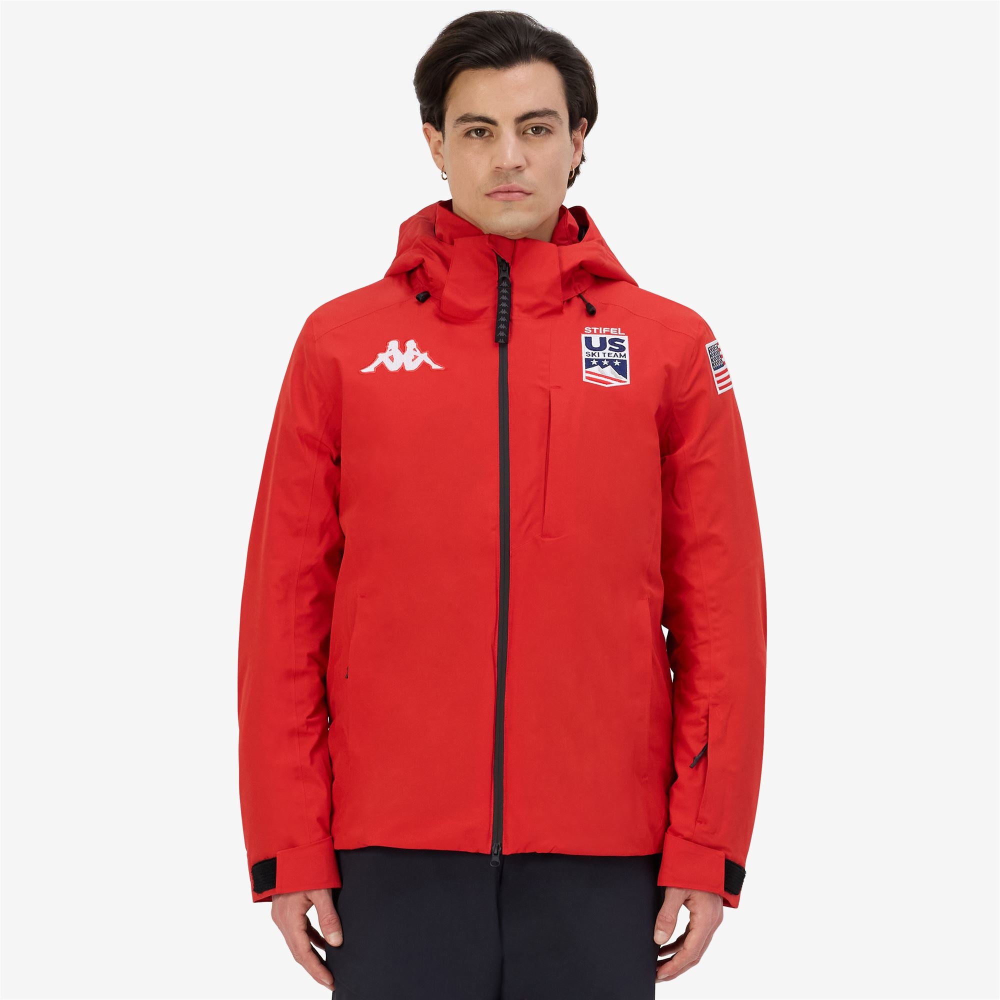 Men’s padded jacket made from 2-layer stretch fabric. featuring WATERPROOF PROTECTION 10.000 mm H?O and BREATHABILITY 10.000 g/m2/24h. enhanced with a PFC-free water-repellent treatment. The differentiated insulation provides targeted warmth: 120 g on the body. 100 g on the arms. and 80 g on the collar and hood. Slim fit ensures a close. functional fit.Features include a detachable hood. flap pockets with zip closure. ventilation zips. internal snow gaiter. elastic cuffs. taped seams. and customizable adjustments. combining protection. comfort. and practicality for the mountains and winter sports. Distinctive details include the Omini logo and US Ski and Snowboard Team customizations