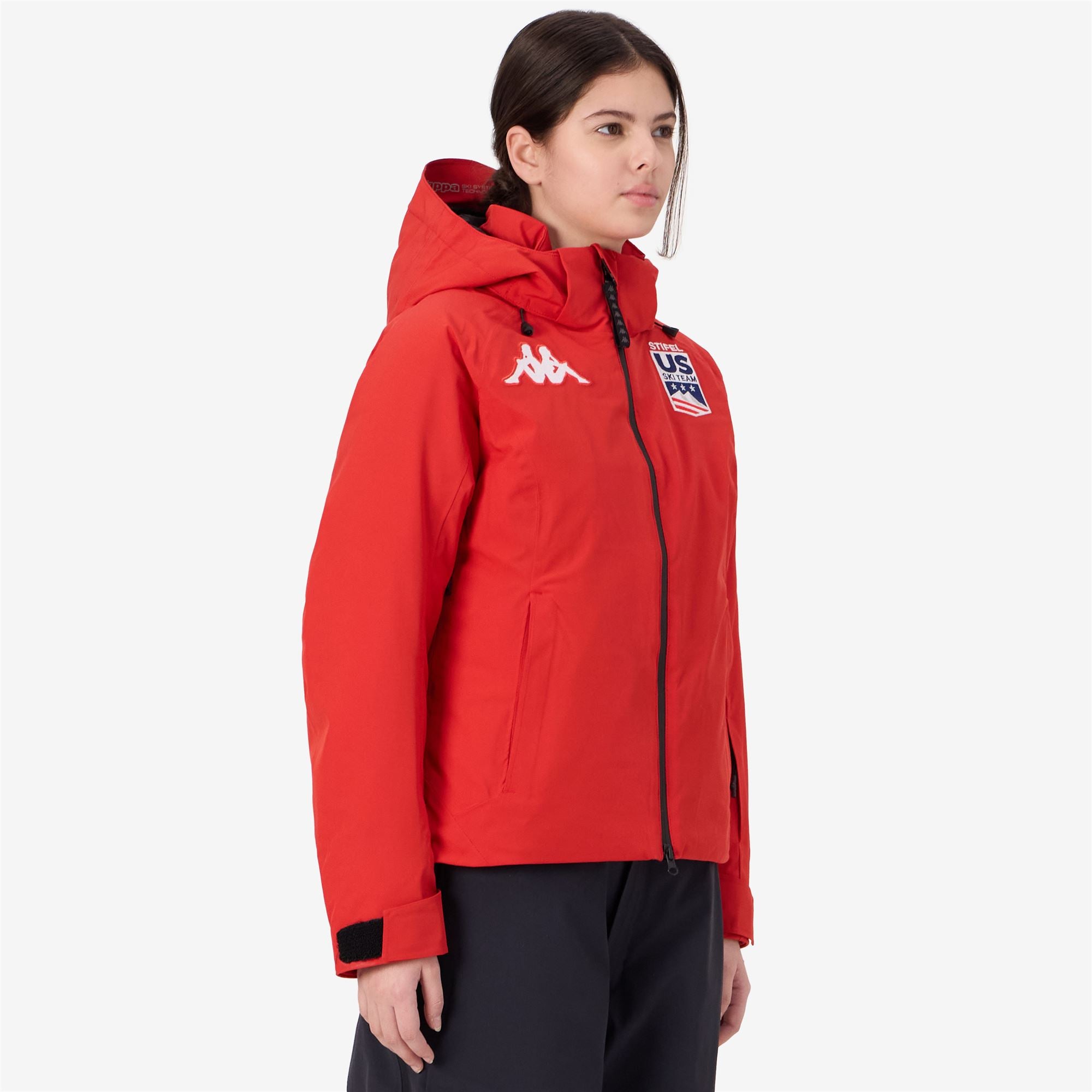 Women’s padded jacket made from 2-layer stretch fabric. featuring WATERPROOF PROTECTION 10.000 mm H?O and BREATHABILITY 10.000 g/m2/24h. enhanced with a PFC-free water-repellent treatment. The differentiated insulation provides targeted warmth: 120 g on the body. 100 g on the arms. and 80 g on the collar and hood. Slim fit ensures a close. functional fit.Features include a detachable hood. flap pockets with zip closure. ventilation zips. internal snow gaiter. elastic cuffs. taped seams. and customizable adjustments. combining protection. comfort. and practicality for the mountains and winter sports. Distinctive details include the Omini logo and US Ski and Snowboard Team customizations.