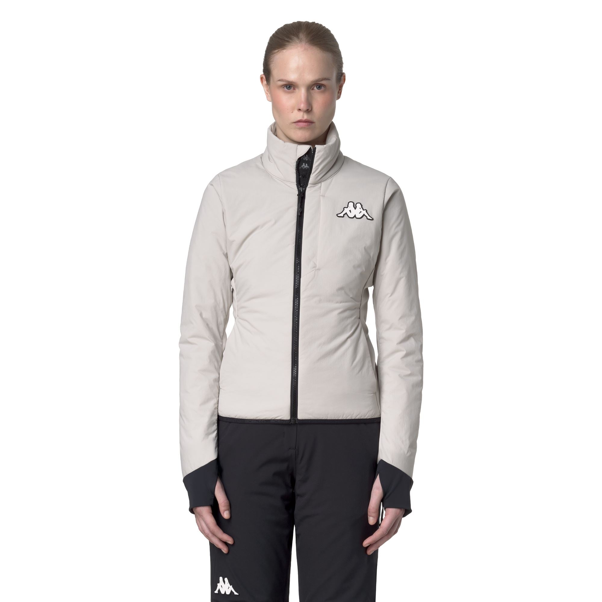 Women’s padded jacket made from ripstop and bonded fabric. featuring WATER PROTECTION technology to withstand the elements. Primaloft? 80 insulation provides lightweight warmth.Slim fit ensures a close. functional fit. Features include a front zip closure. side pockets. and softshell side panels for enhanced comfort and mobility. The design is completed with the applied 8CENTO logo and applied Omini logo. creating a technical and distinctive look.