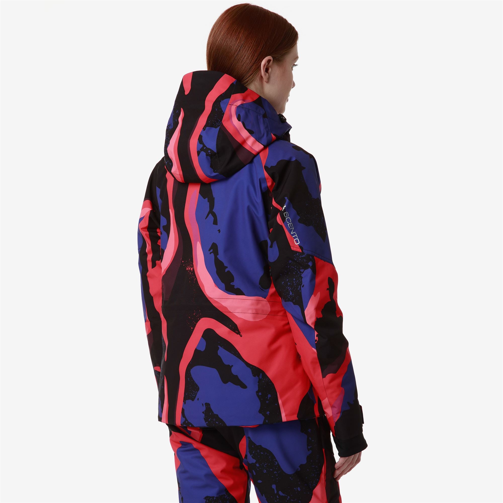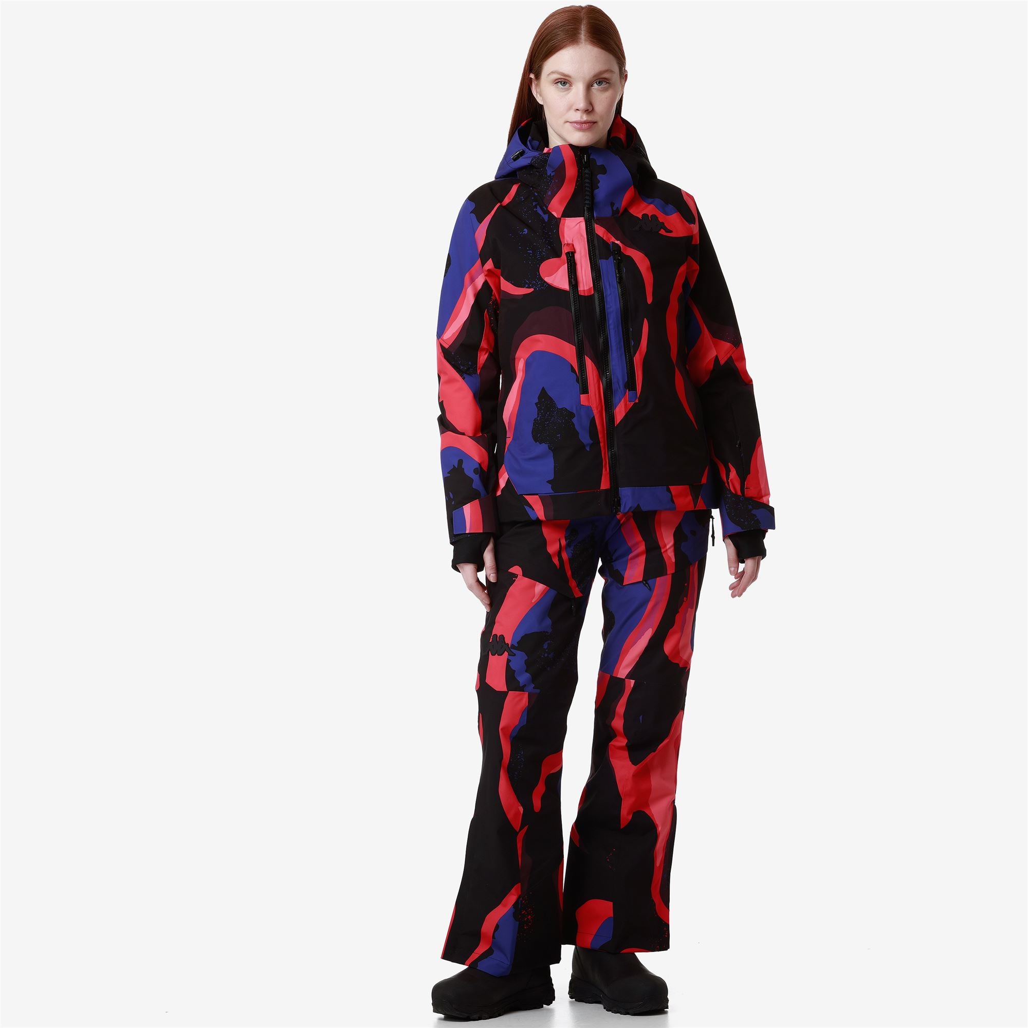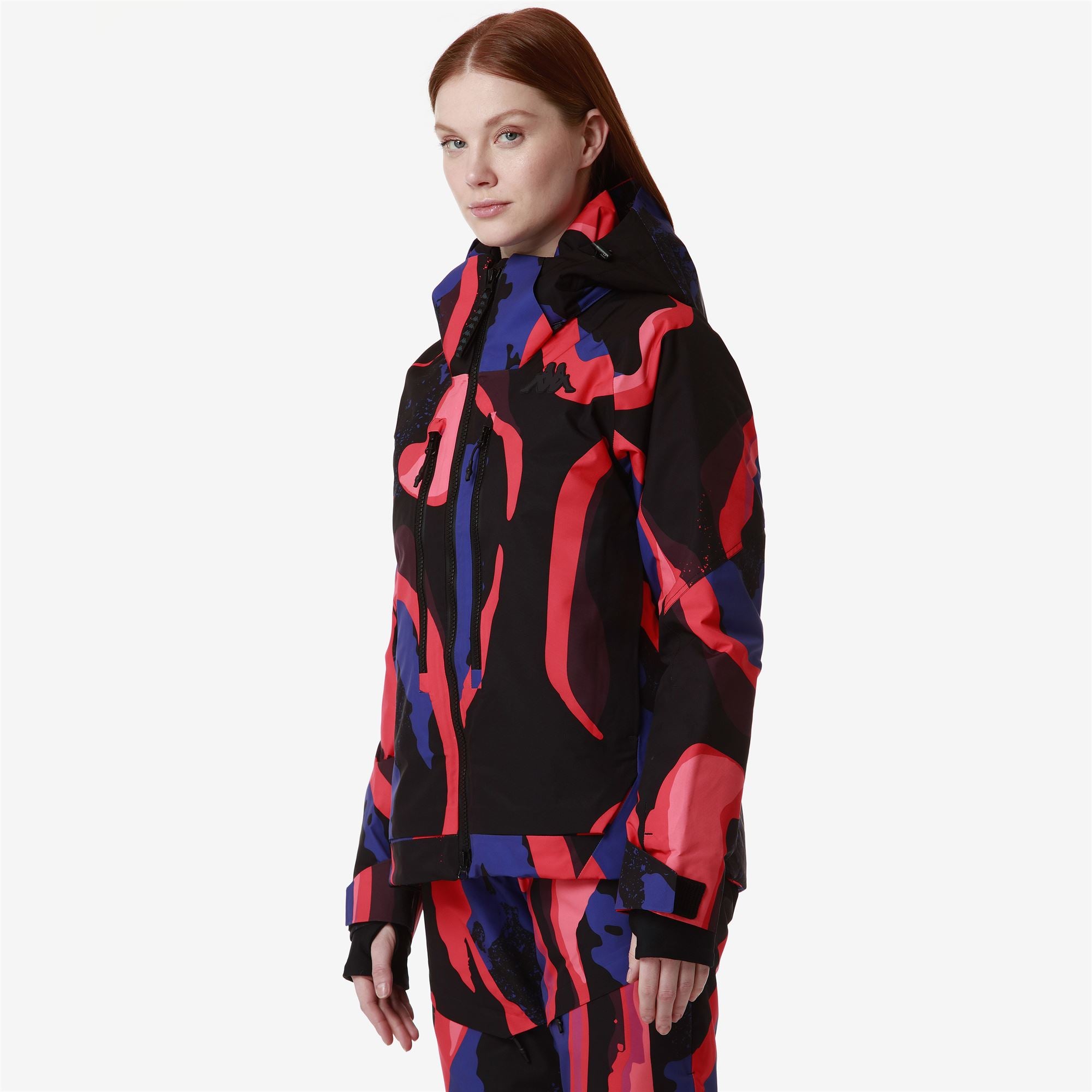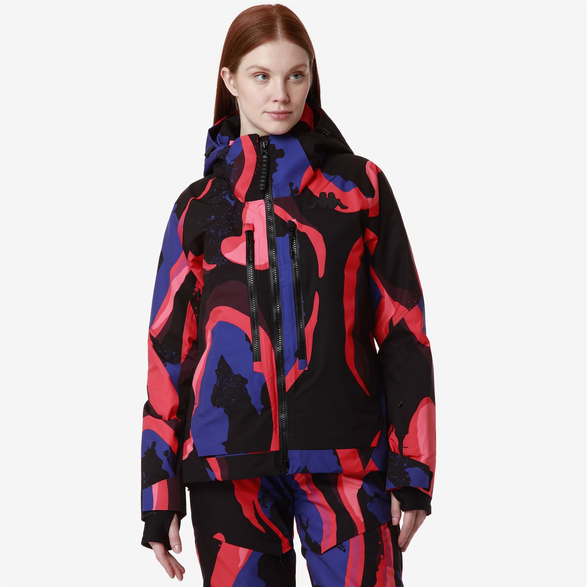 SPORT.Woman padded jacket in stretch fabric with WATERPROOF PROTECTION 10000 mm. BREATHABILITY 10000gr/m2/24. padding 180gr for body. 120gr for sleeves. 100g for collar and hood. KAPPA SKI SYSTEM TECHNOLOGY ???.SLIM FIT. Detachable hood. waterproof zip pockets. reinforced shoulder. ventilation zip. inner gaiter. cuff gaiters in stretch fabric. heat sealed seams. regulation adjustments. grafica all-over.Silicone Omini Logo applied.