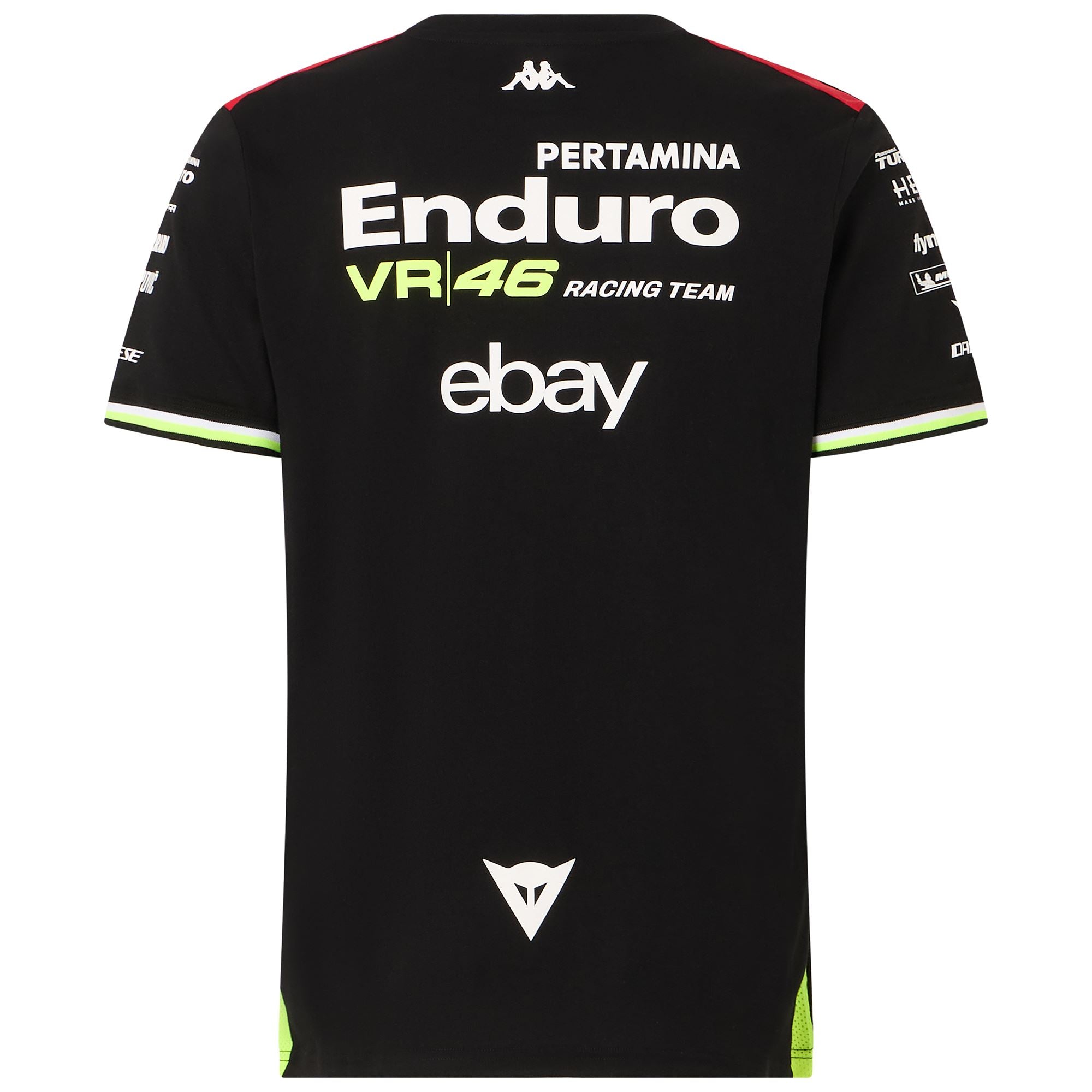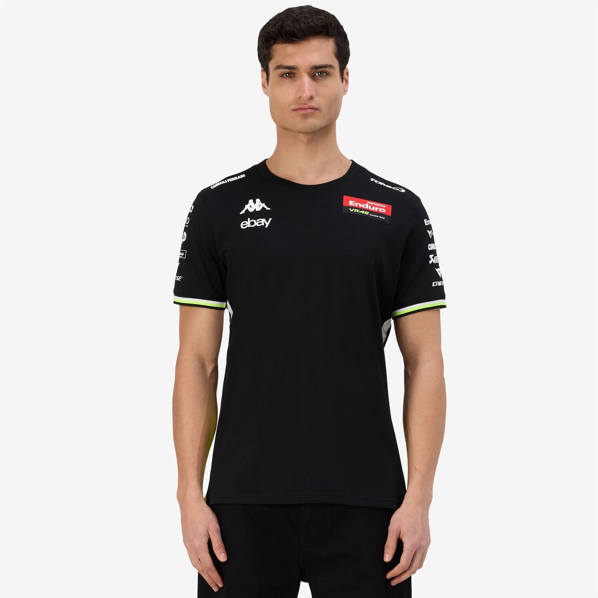 GARA.T-shirt for man in cottonpoly.REGULAR FIT.Short sleeve. roundcollar. insert on shoulders in contrast color. sides and shoulders inserts.Omini logo. Team personalizations and sponsors applied with heat transfer.VR46 RACING TEAM.