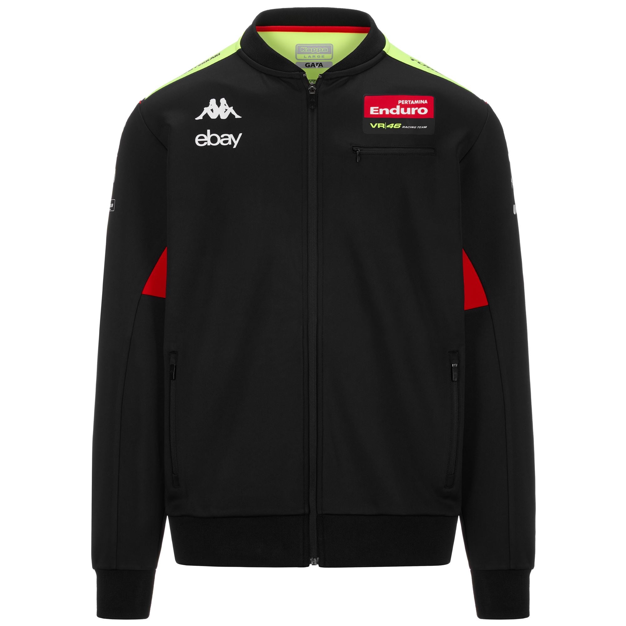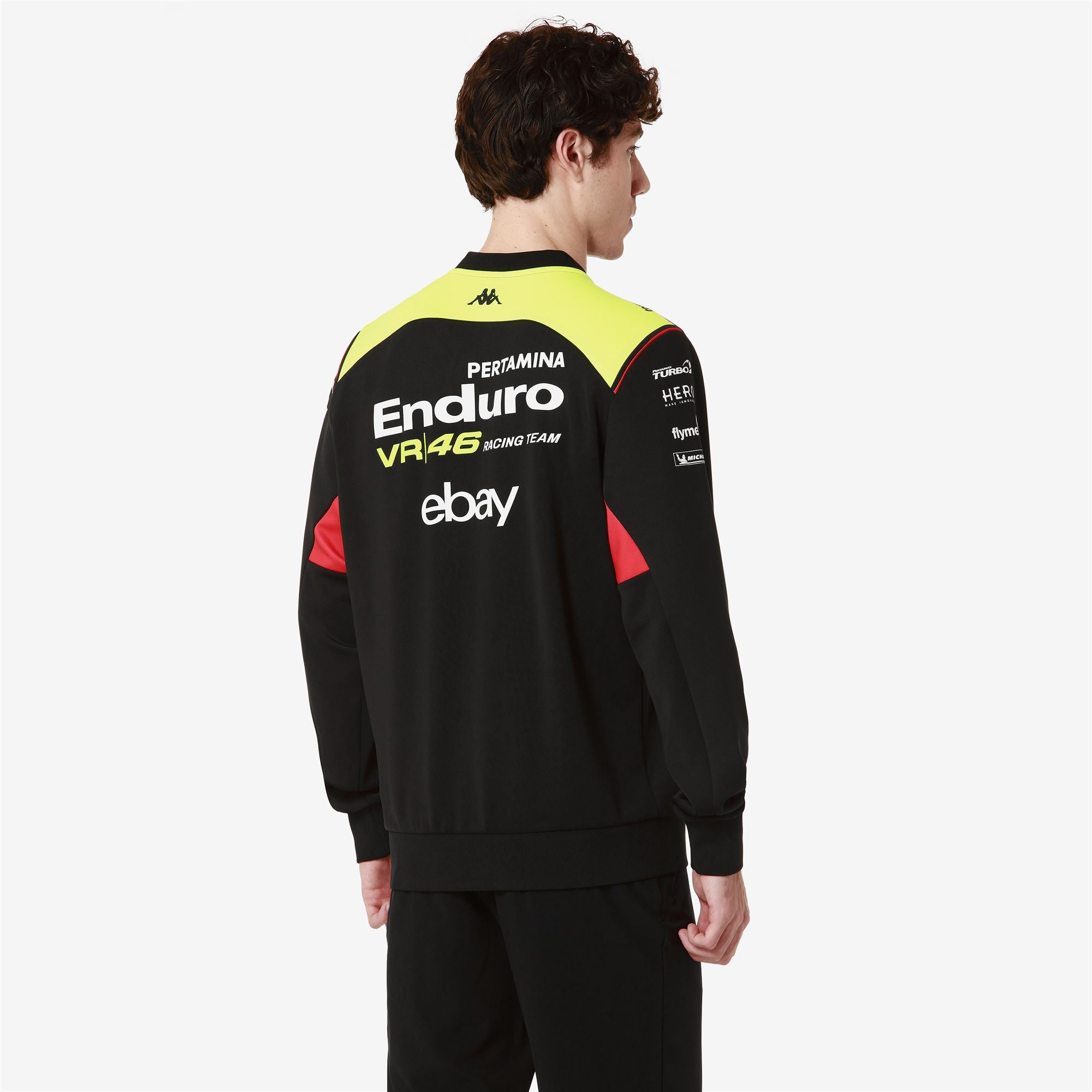 GARA.Man fleece in interlock fabric with elastane.REGULAR FIT.Opening fullzip. side pockets with zip. collar and bottom rib. insert on back.Omini logo. Team personalisation and sponsor sublimated.VR46 RACING TEAM.