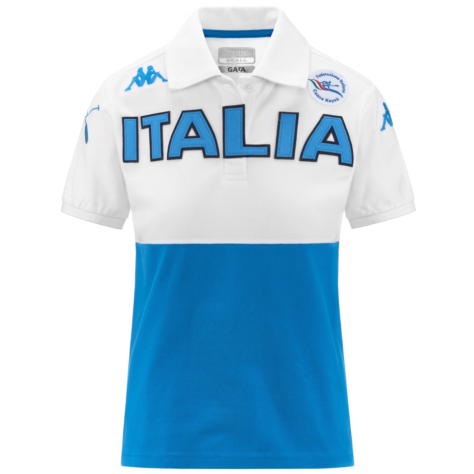 GARA.Women’s technical polo shirt in pique fabric.HYDRO-WAY & UVA PROTECTION. SLIM FIT. Short sleeves. button on front plate. ribbed collar and sleeve edging.Omini logo embroidered on front and sleeve. federation logo and ITALIA lettering in felt applied to front. federation icon embroidered on sleeve.FEDERAZIONE ITALIANA CANOA & KAYAK.