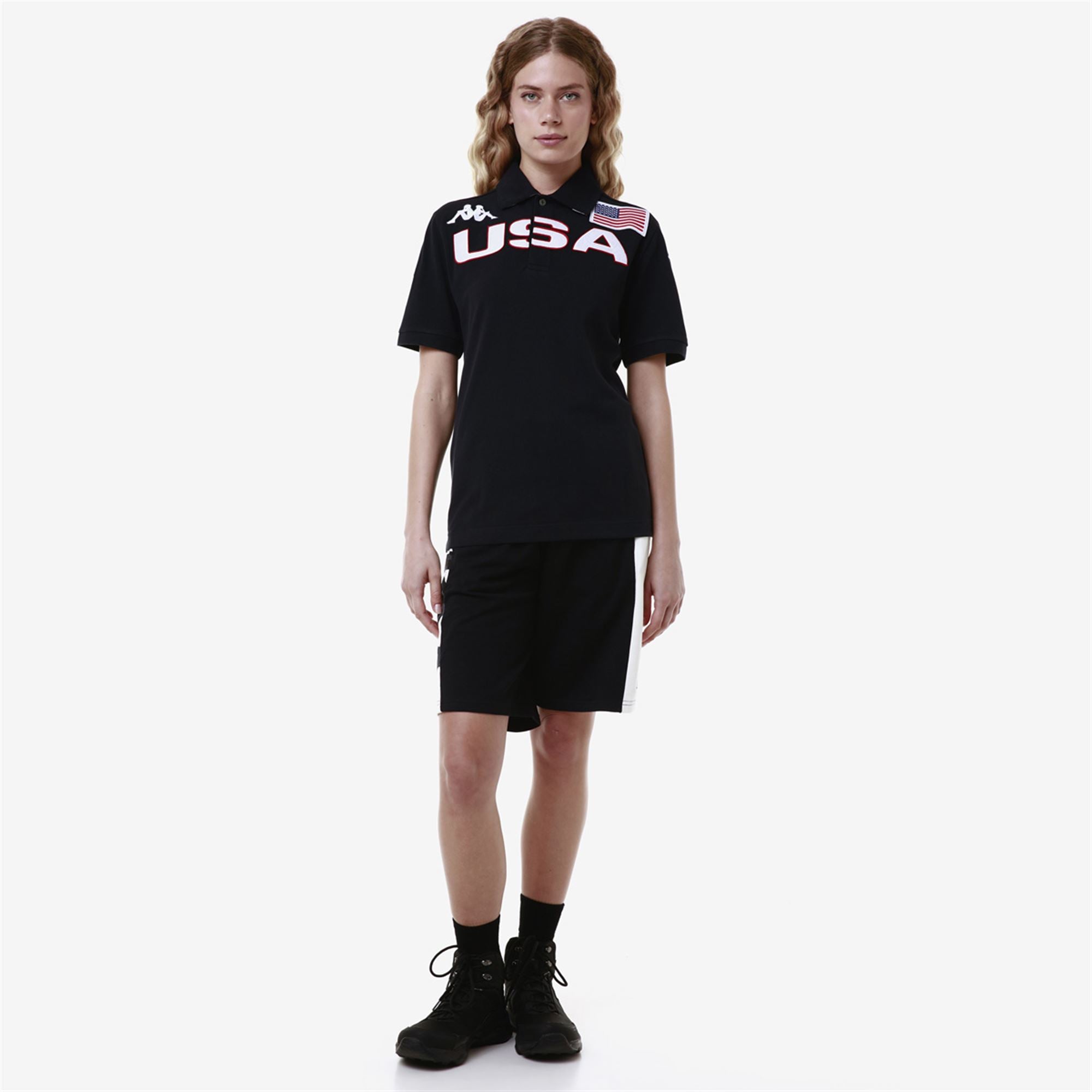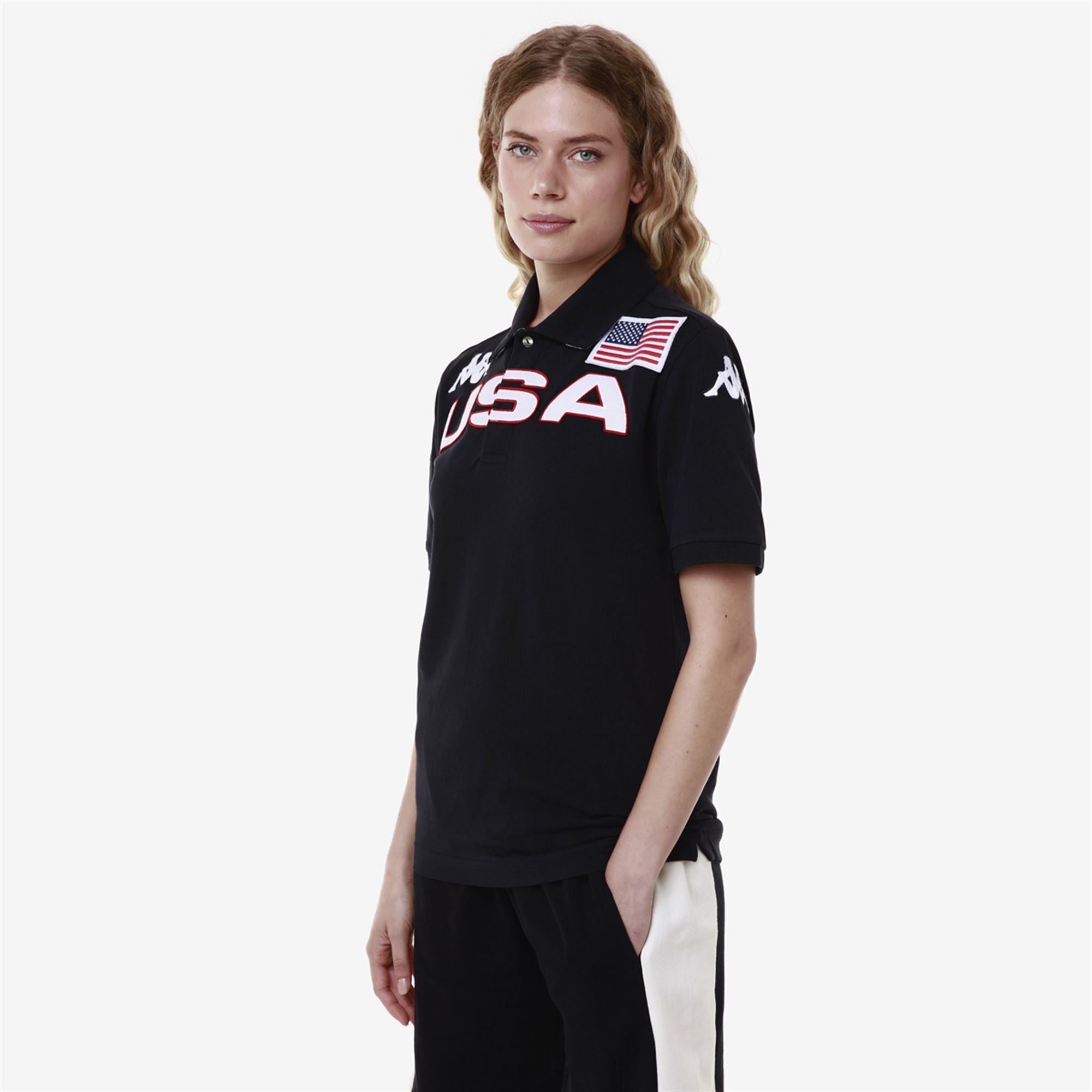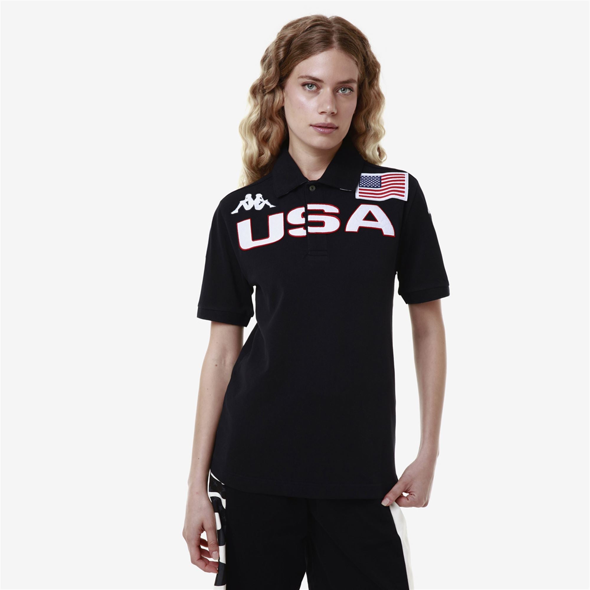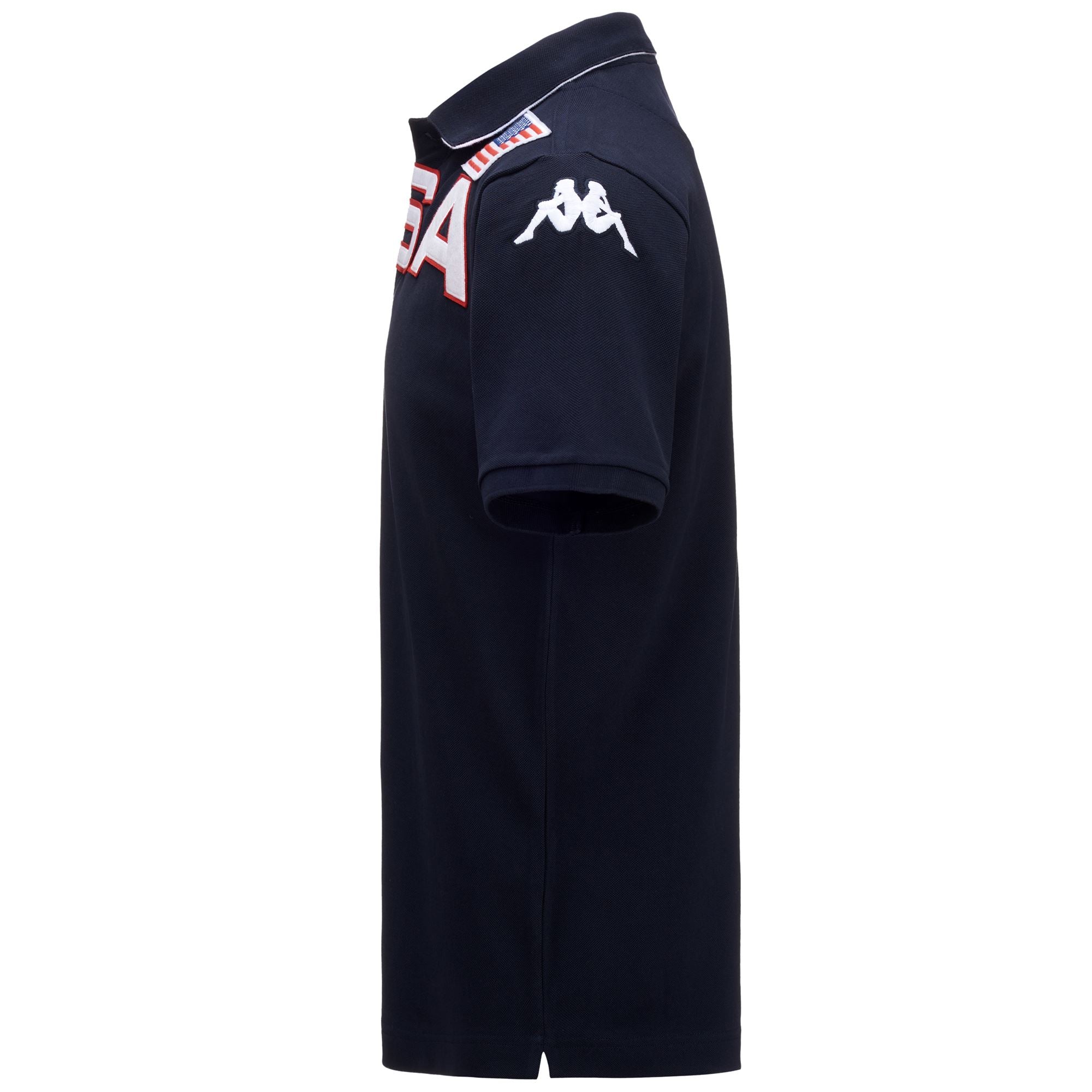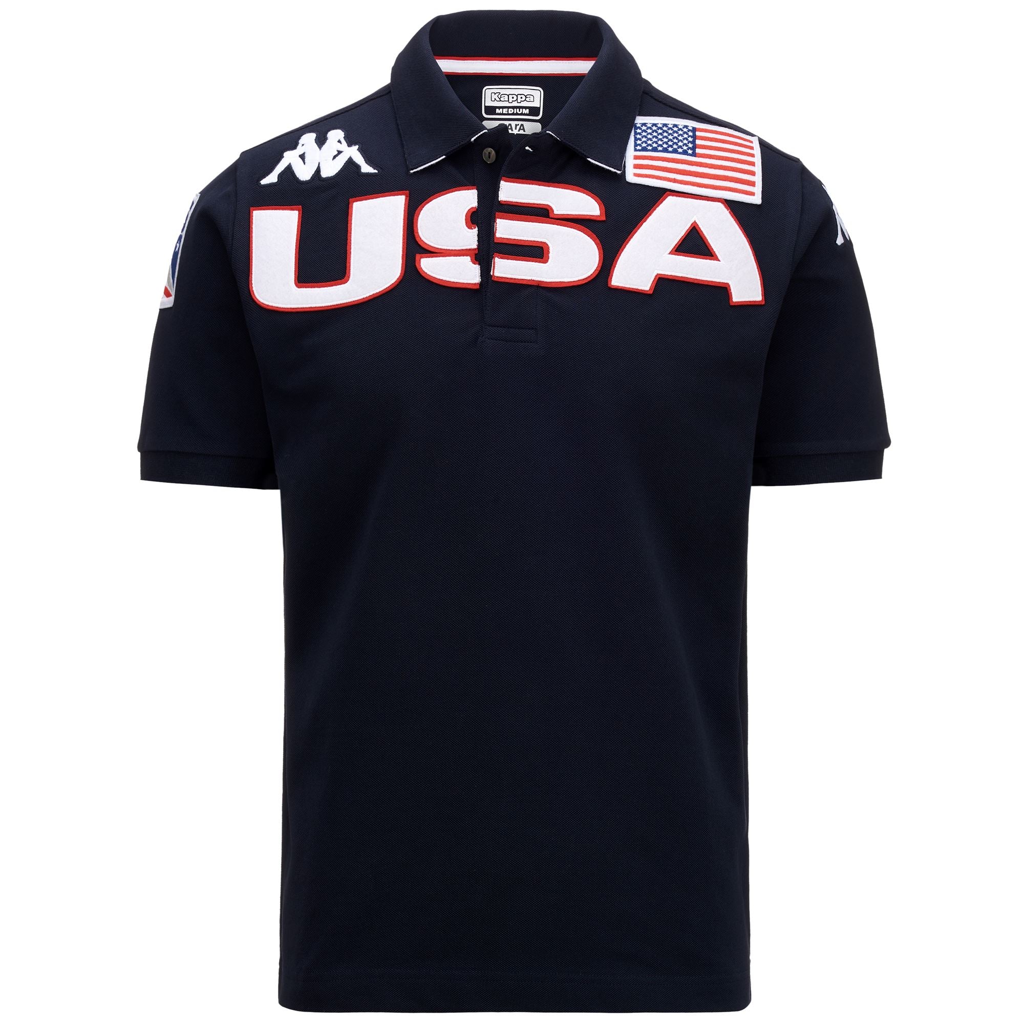 GARA.Polo for man in piquet.SLIM FIT.Front opening with two buttons. halfmoon on back.Emby Omini logo on chest and sleeve. front ‘USA’ lettering in double felt applied. Flag and Team logo in double felt applied.US SKI AND SNOWBOARD.
