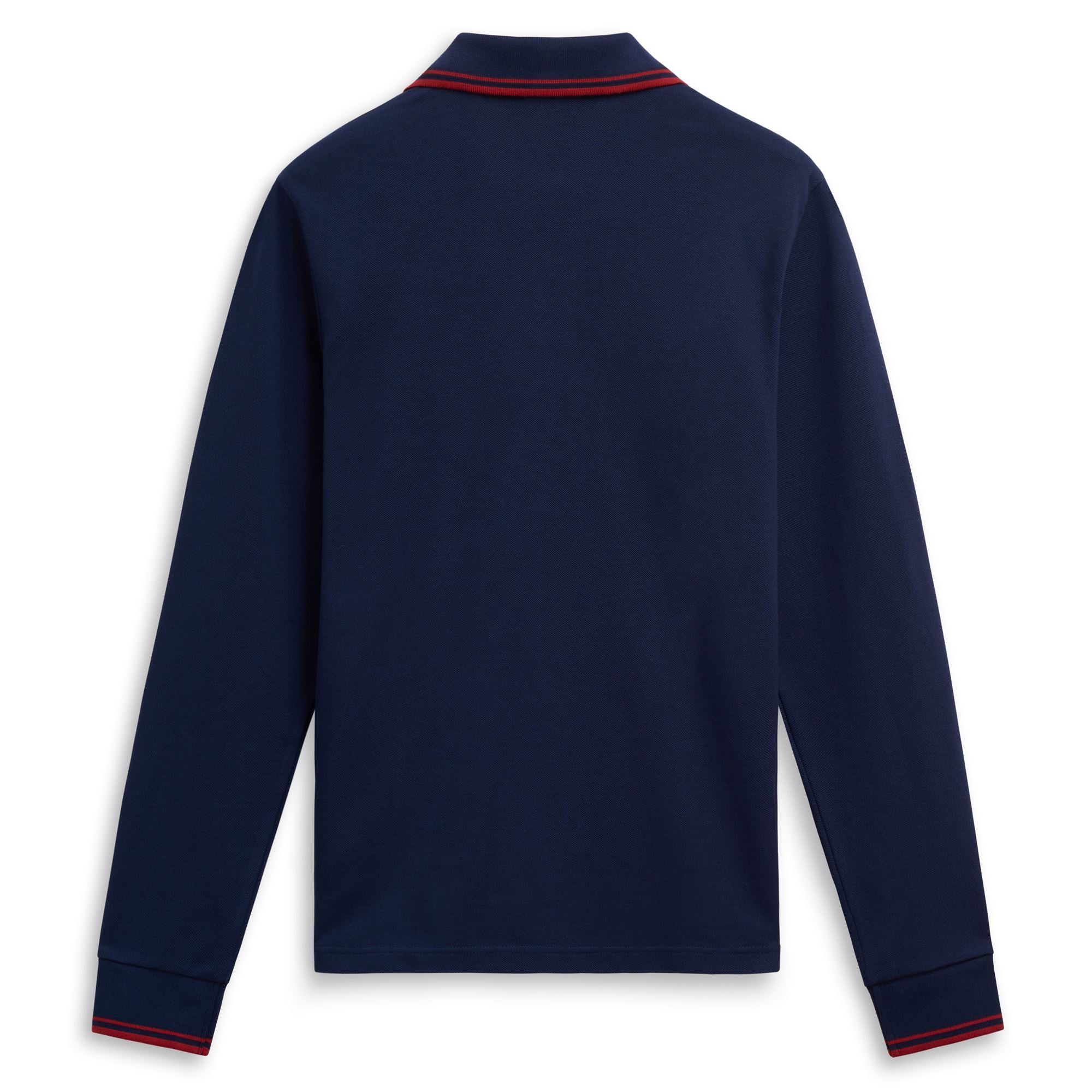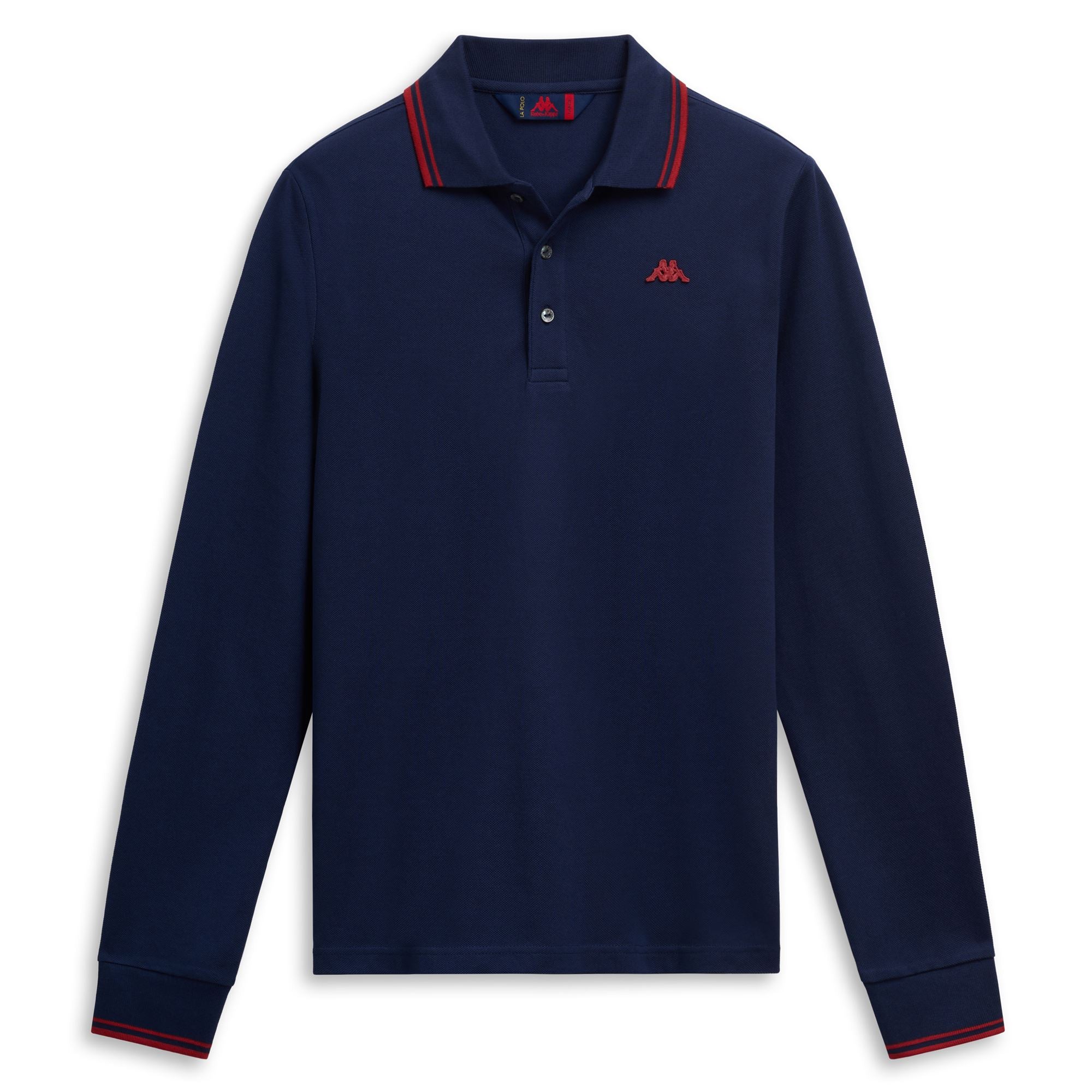 CLASSICO.Polo long sleeves in cotton piquè. SLIM FIT. Collar and sleeves border in flat knit rib in plain color with striped borders. front placket with personalized nacre buttons.Omini patch applied on chest.