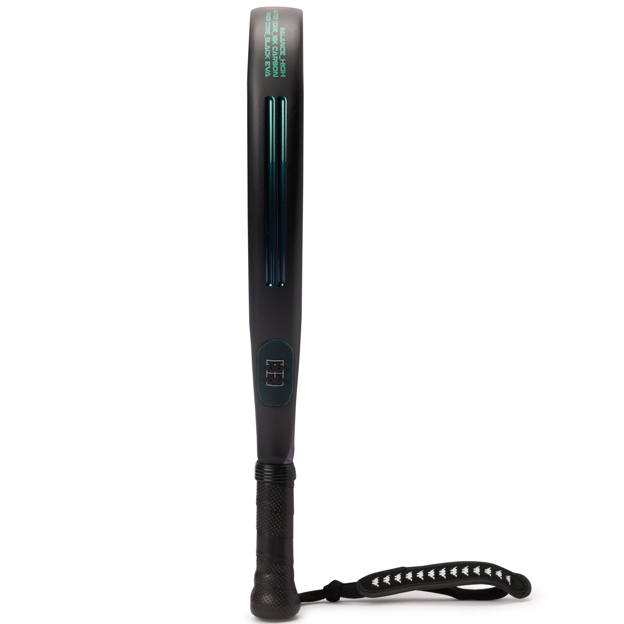 SPORT.Padel racket in 18K carbon.Hybrid shape. frame in 100% carbon. face in 18K carbon. inner core in black EVA. matt finishing. thickness 38mm. weight 360-370 gr. grip on handle. adjustable wristband. 3D relief on face.Omini logo and graphics print on front and back with metal effect. Omini Padel logo and infographics on frame with metal effect.