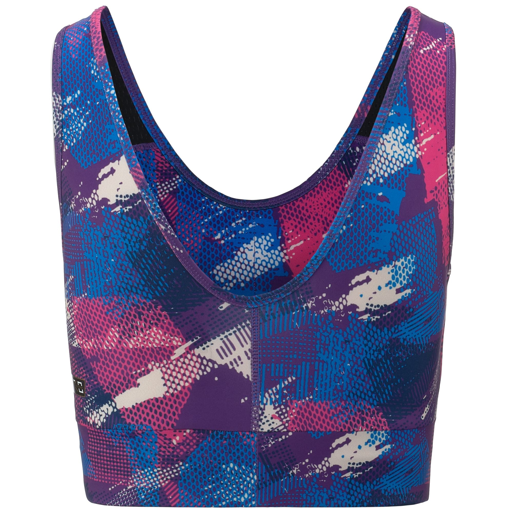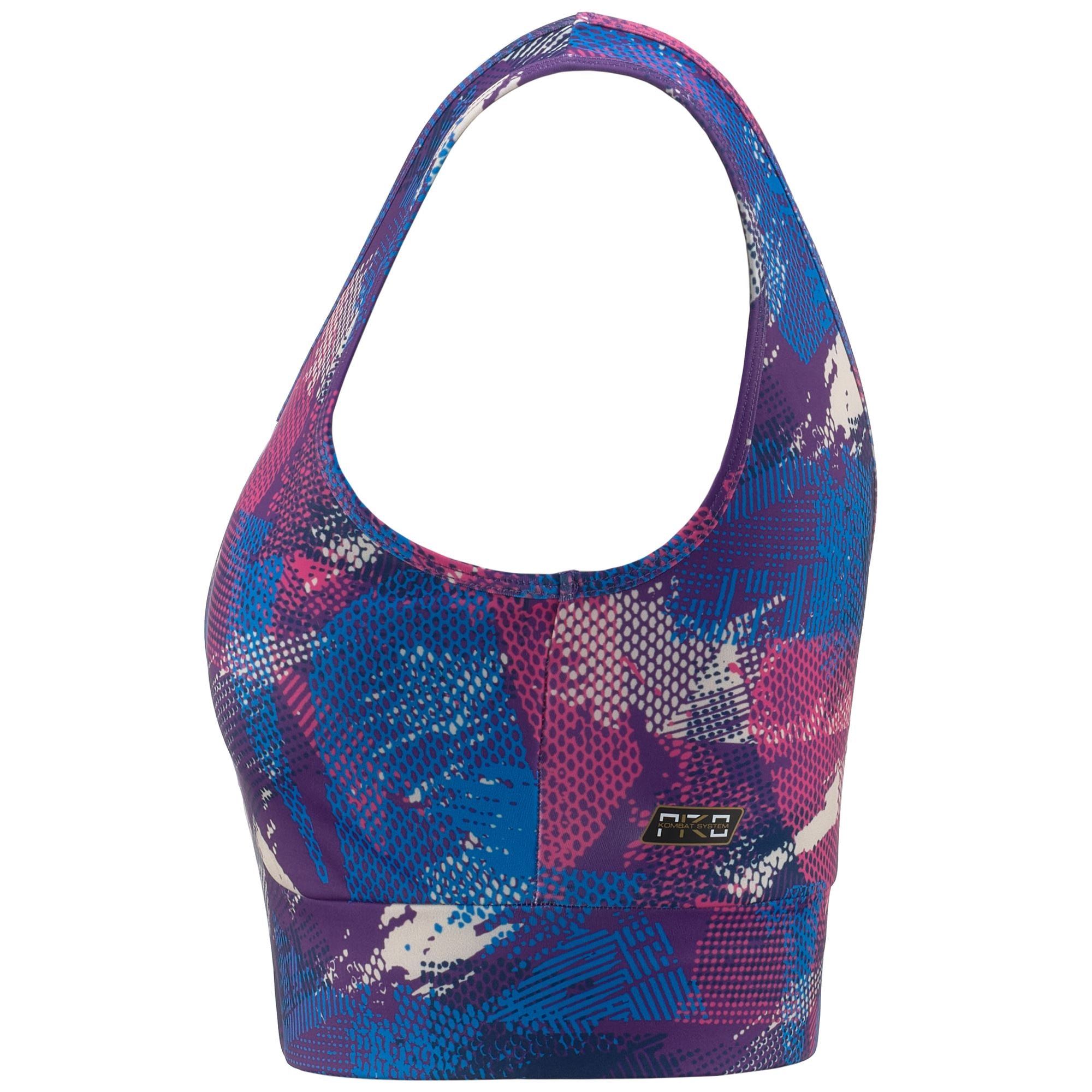 SPORT.Woman top in stretch jersey fabric.SKIN FIT. Round neckline on front. V shape neckline on back. ergonomic shape on front. allover printed. removable cups.Logo Omini printed on front. Pro Kombat System logo on back. Omini graphic printed on bqack.