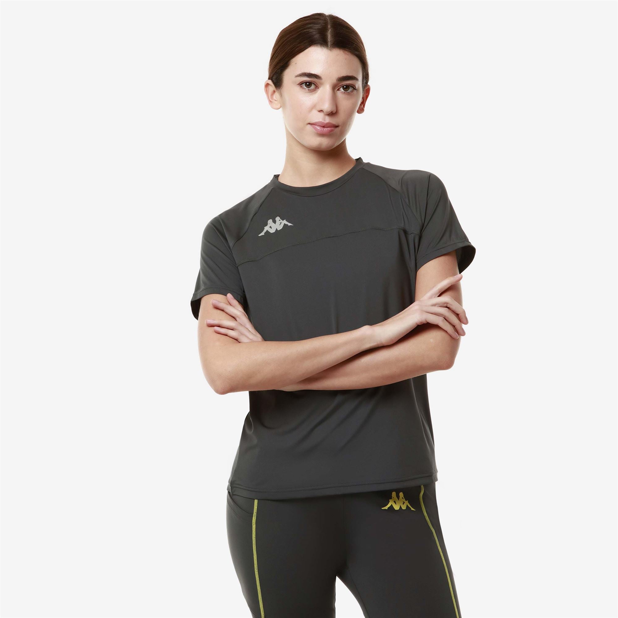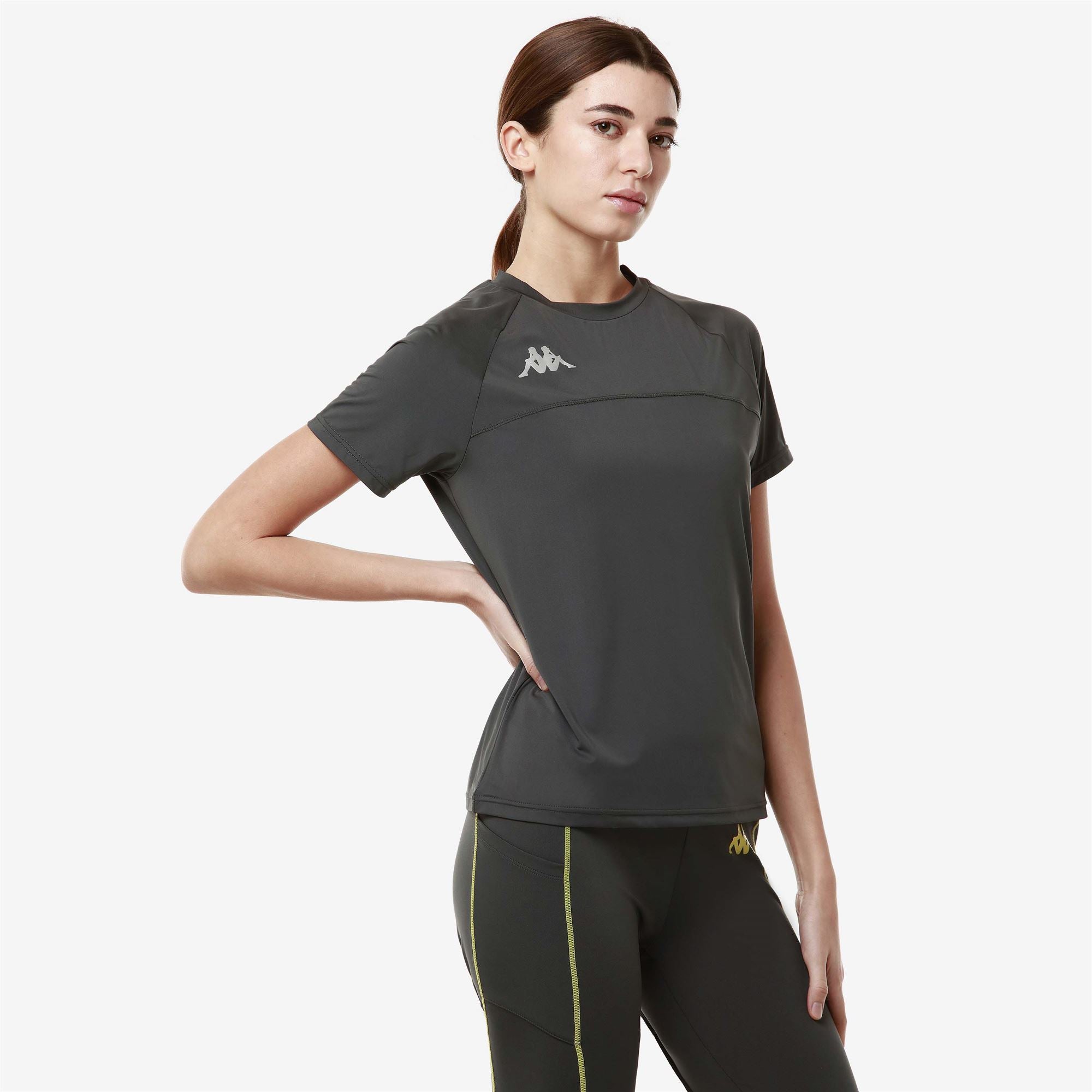 SPORT.Woman t-shirt in jersey fabric.SLIM FIT. Short sleeves. round neck. mesh inserts on back.Transfer Omini logo on front. transfer Kombat Pro System logo. Omini Graphic printed on side.