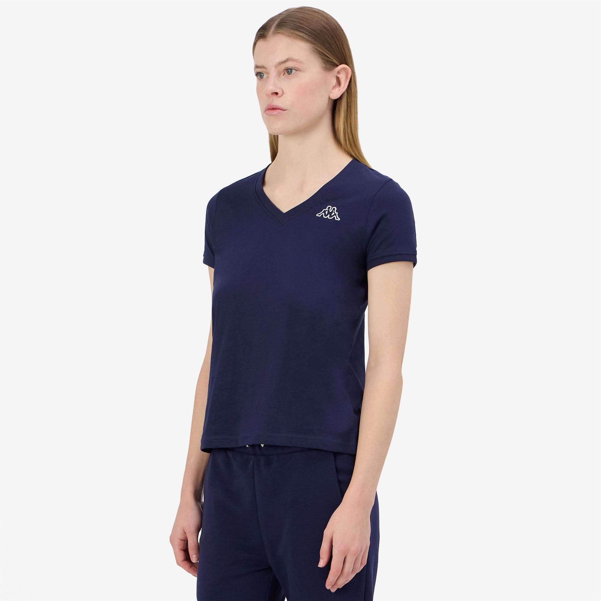 LOGO.Woman t-shirt in jersey fabric. V-neck.REGULAR FIT.Short sleeves with rib borders.Omini logo embroidered on chest in contrast color.