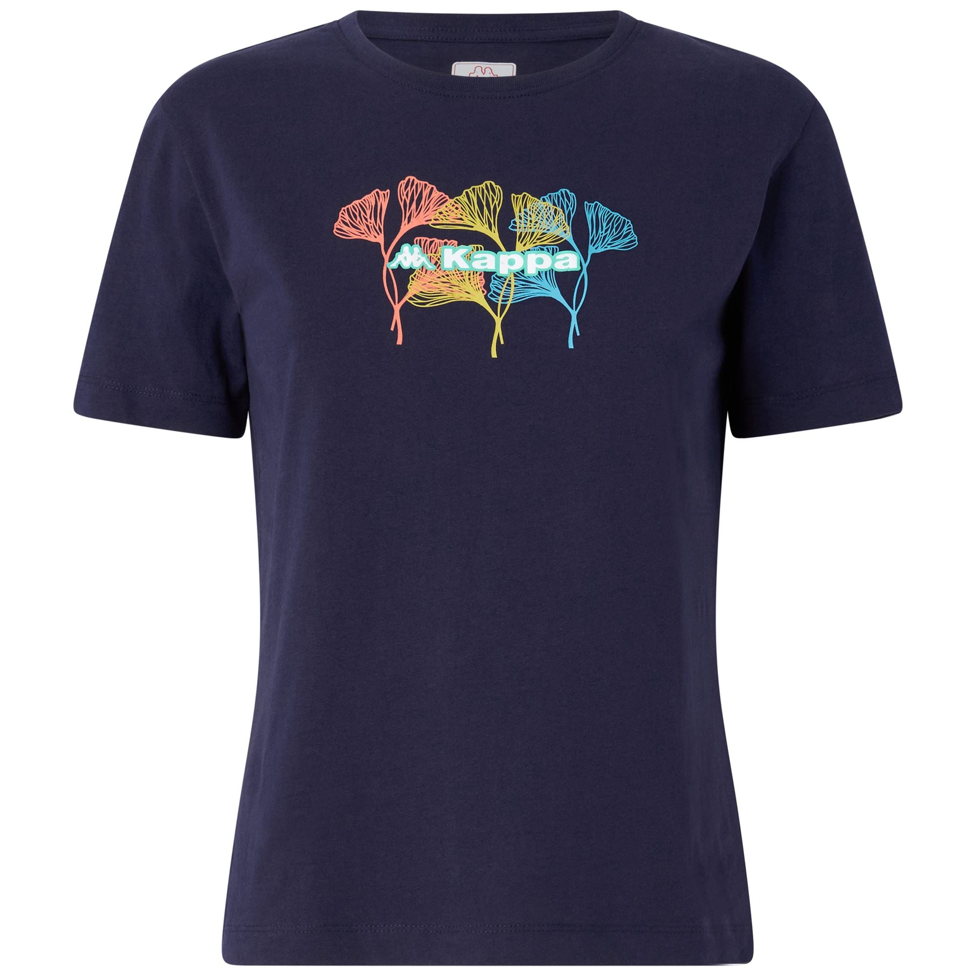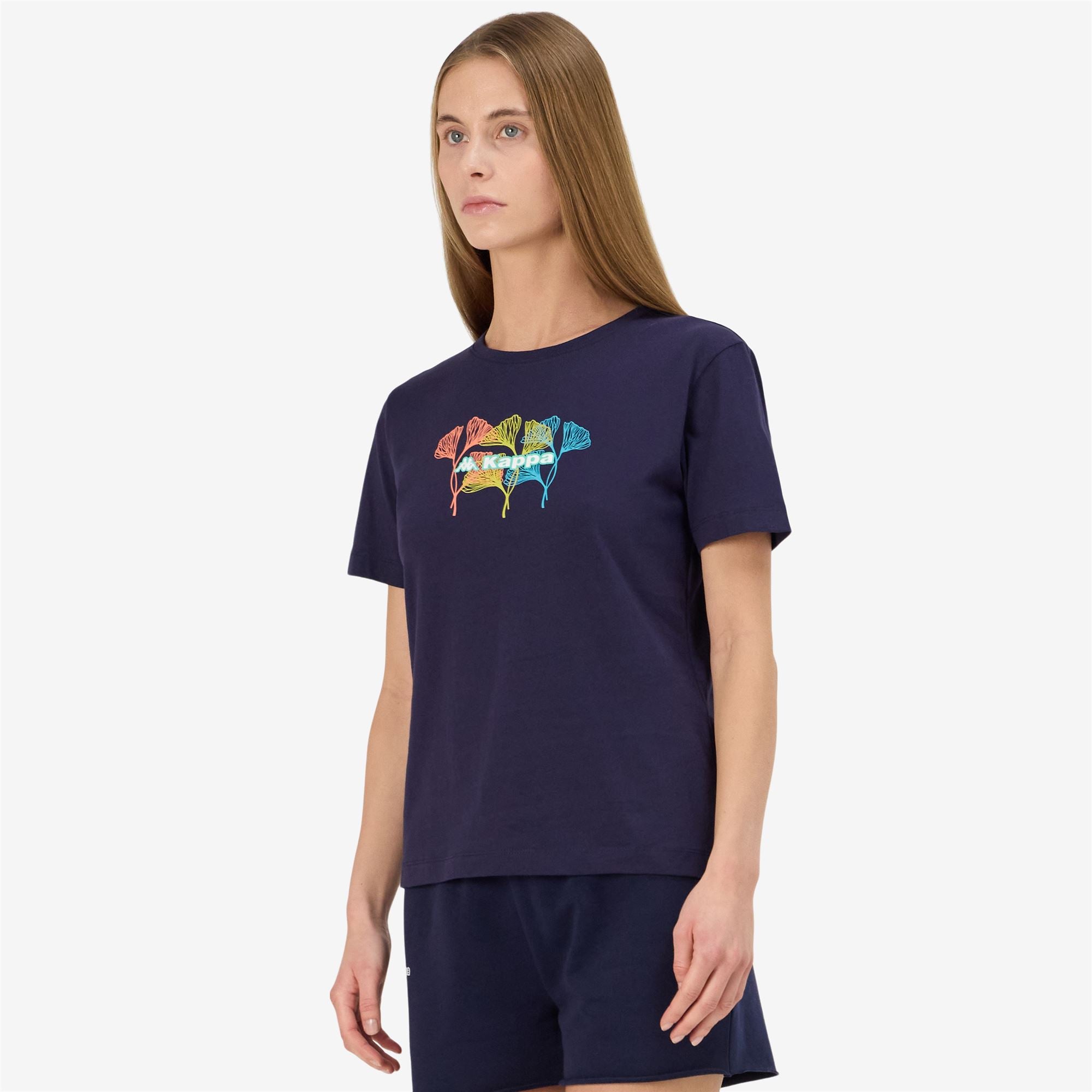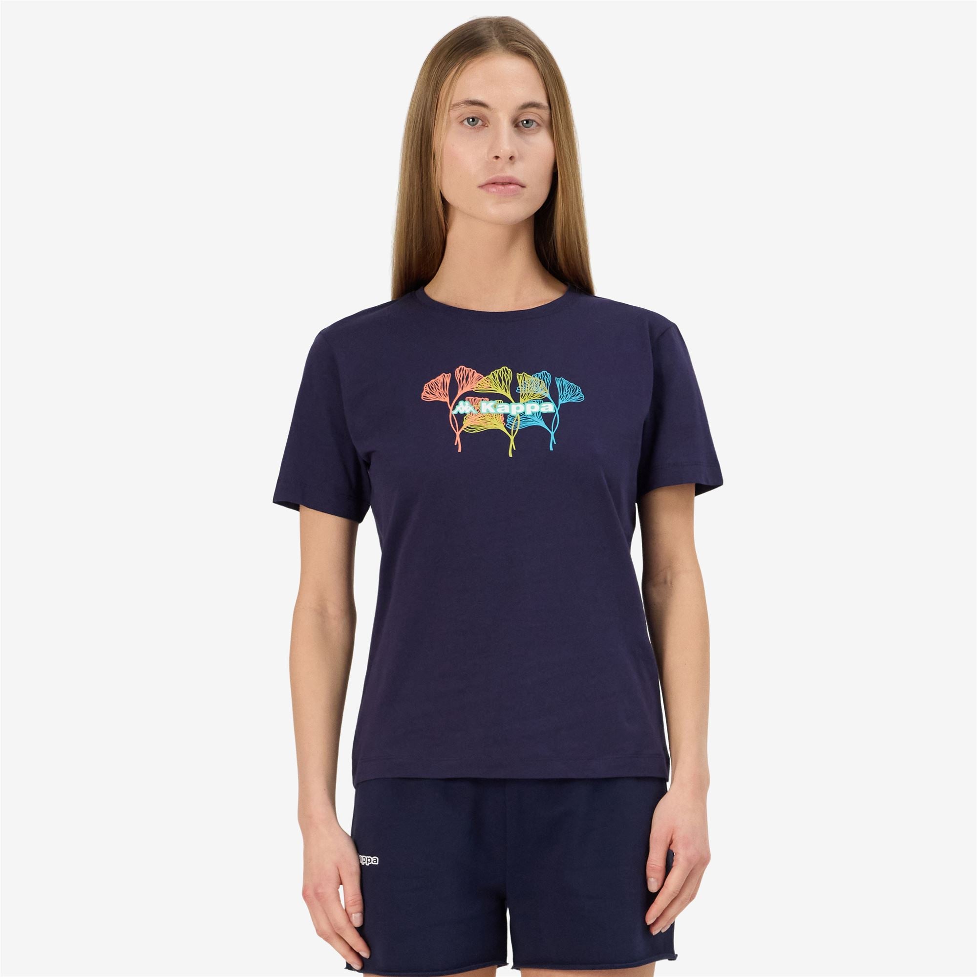 SPORT.Woman t-shirt in jersey fabric.REGULAR FIT.Crewneck. short sleeves.Graphik printed on chest. Omini logo and Kappa lettering printed on back and on sleeve.