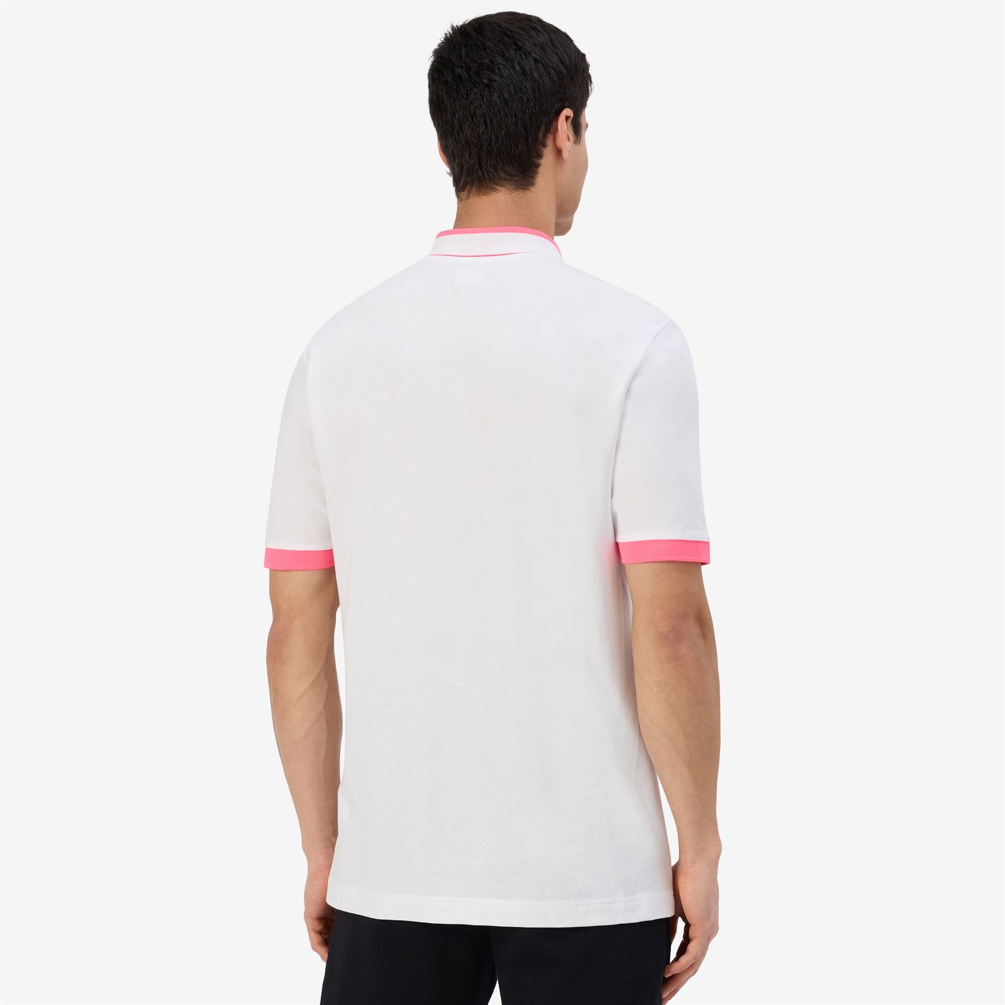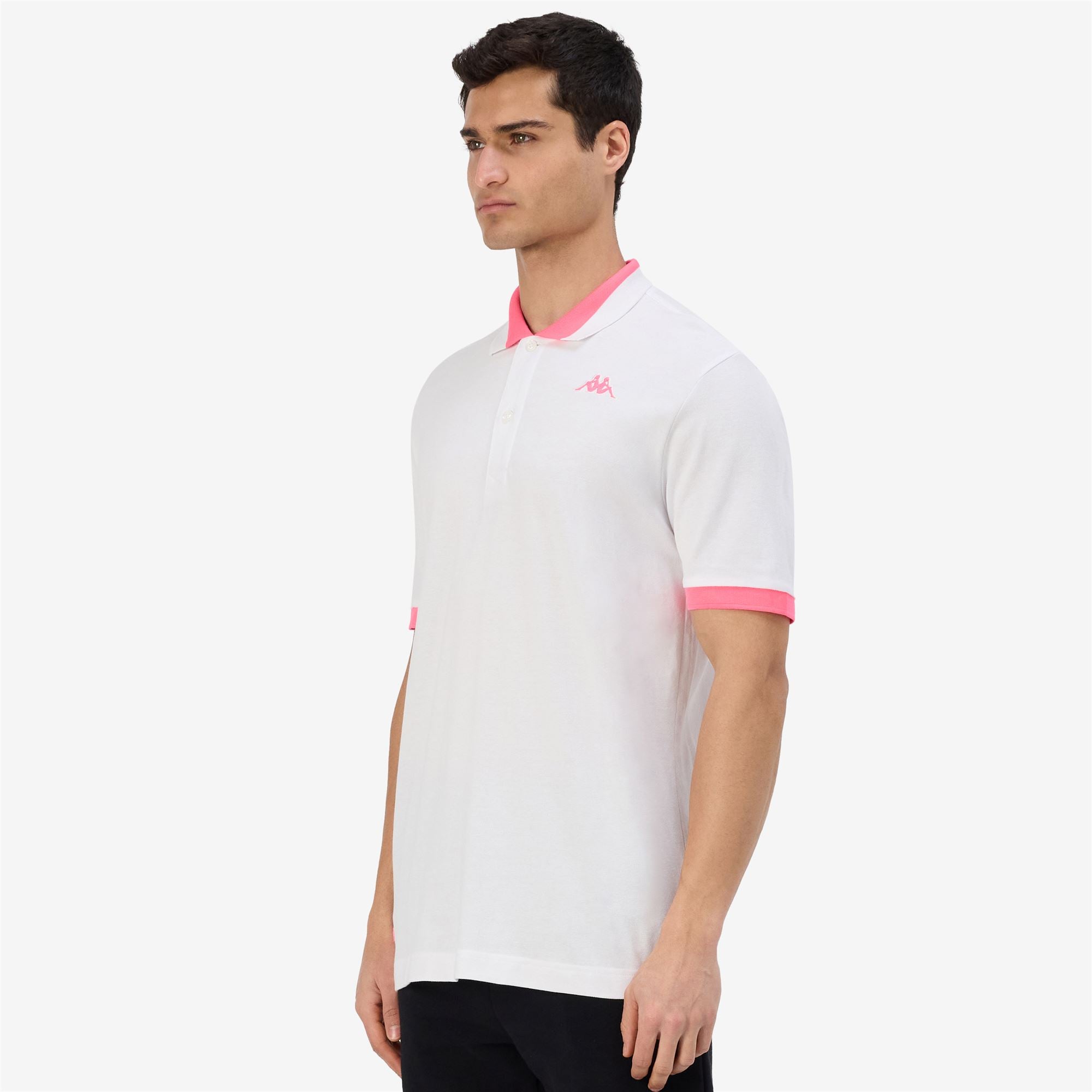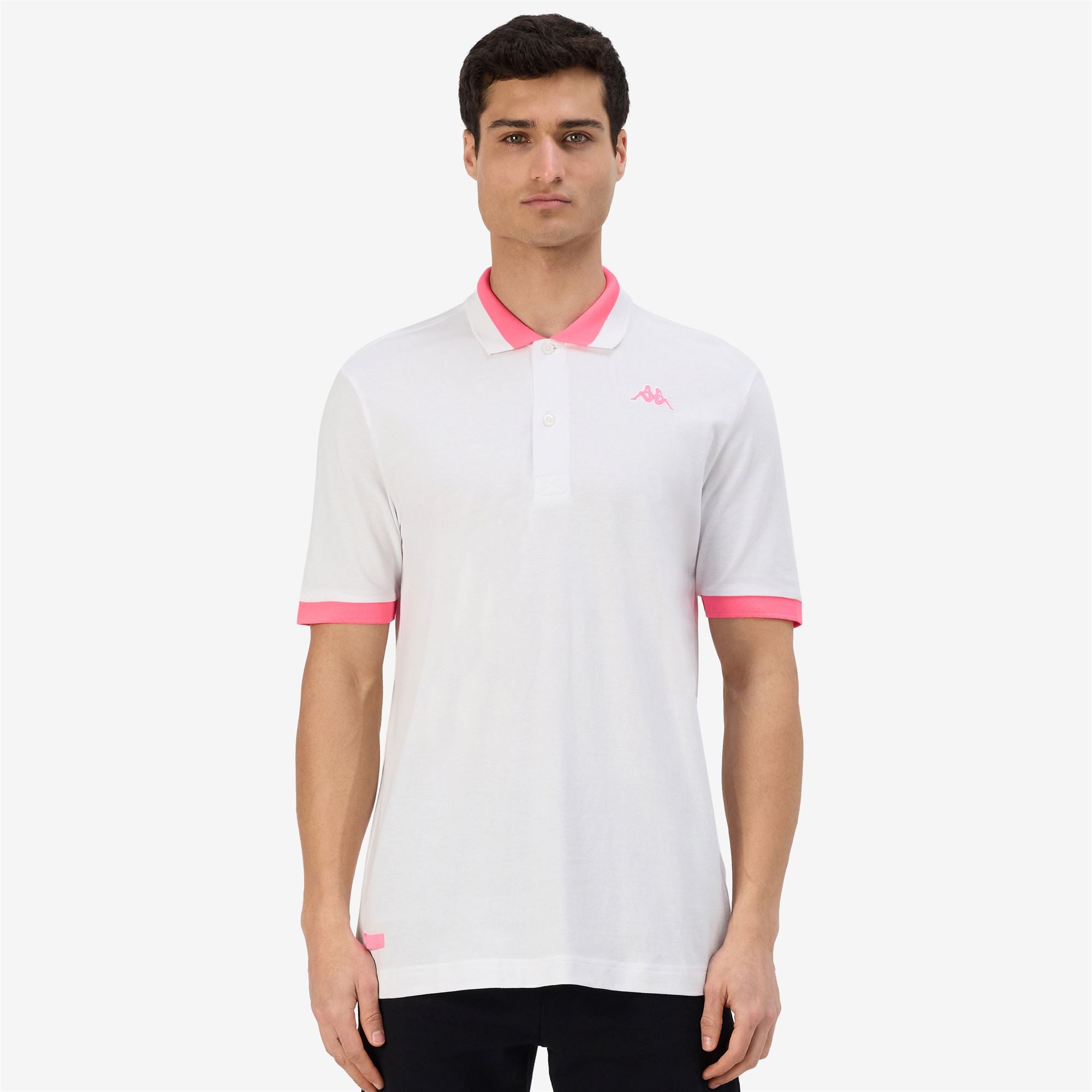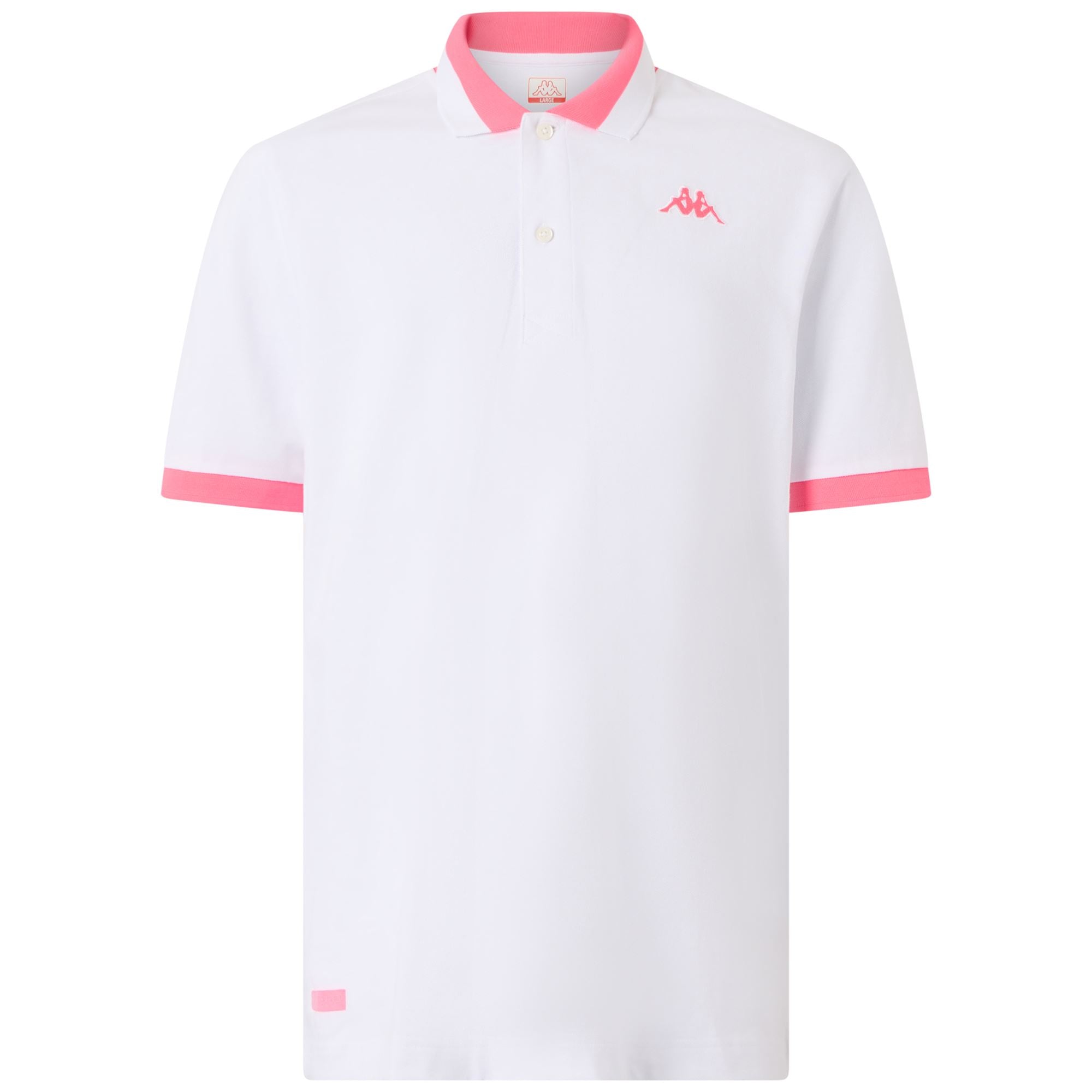 LOGO.Polo man in cotton piquet fabric.REGULAR FIT.Details and contrasting in neon color.Short sleeves. 2 personalized buttons.Flat knit polyester rib collar and borders in neon color.Tape with high density print lettering Kappa in on lower body.Omini logo embroidered on chest.