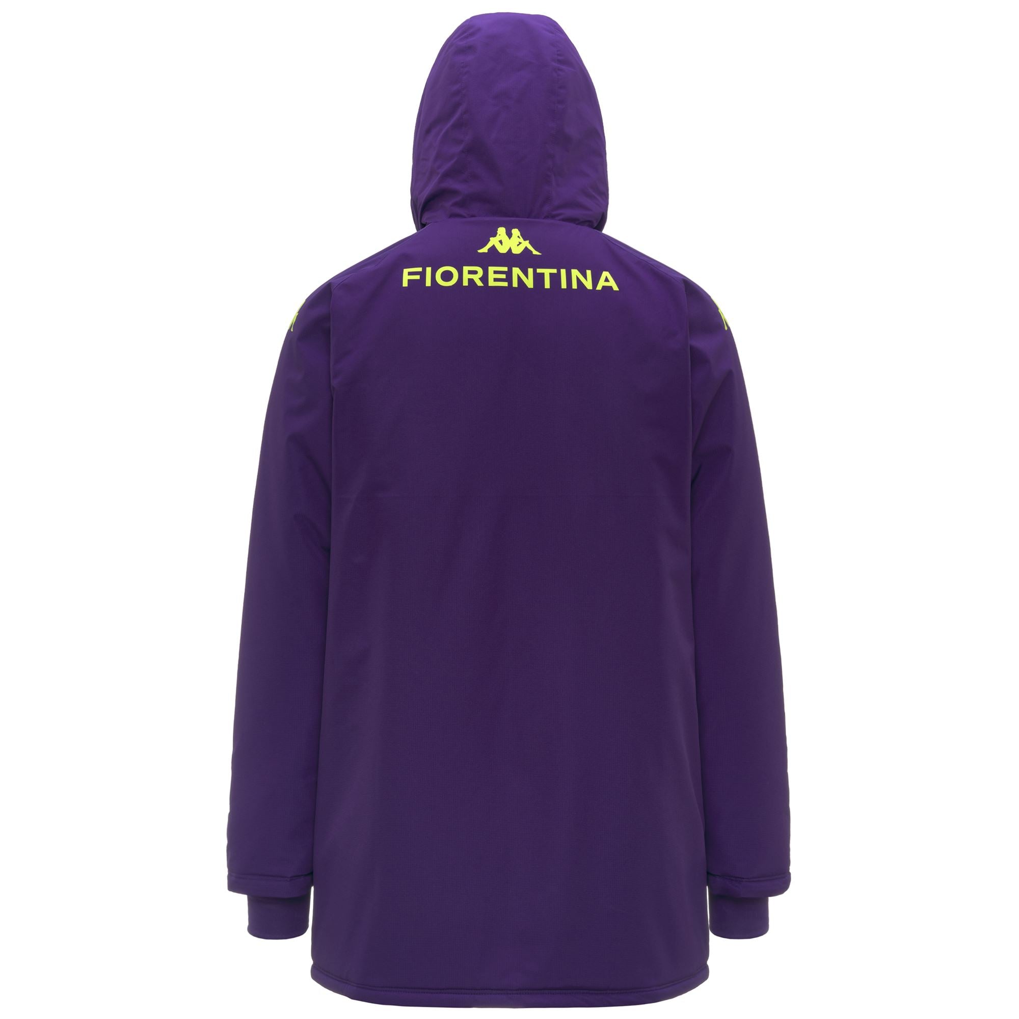 GARA.Training padded jacket for man in textured woven recyceld fabric.REGULAR FIT.Hooded with elastic drawcord. front full zip opening and pockets with zip.Omini logo on chest. on sleeves. on back and Team Patch applied with heat transfer. Lettering on back and Sponsor on front applied with heat transfer.ACF FIORENTINA.