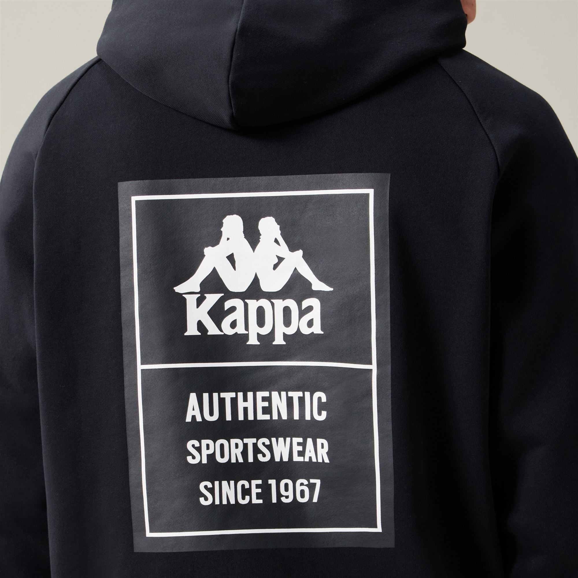 AUTHENTIC. Man hoodie in french terry. COMFORT FIT. Raglan sleeves. ribbed cuffs and lower border. kangaroo pocket on front. Embroidered logo on chest and printed graphic on back.